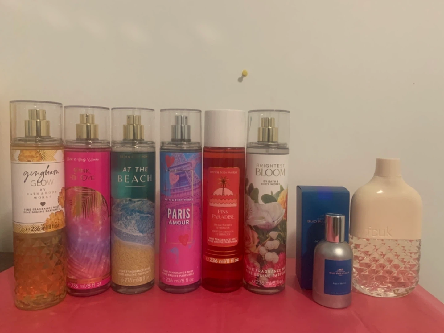 6 full size B&BW Sprays: Brightest Bloom Hibiscus Pink Tie Dye Paris Amour Gingham glow At the beach 2 full size fragrance(used like New) Bag provided for everything Cash only Pickup only at 30 Okra Tomar Crescent