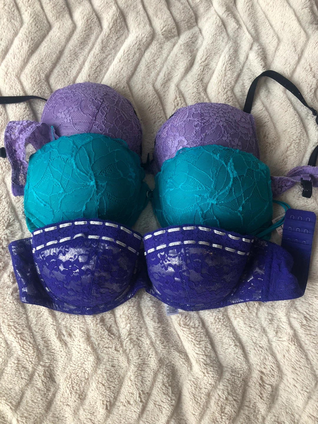 532Selling a bundle of three bras in teal, purple, and blue. All have a pretty lace design and are in good condition! They are from La Senza and are padded for extreme push-up. The Teal and Purple are 36B The blue is 34C