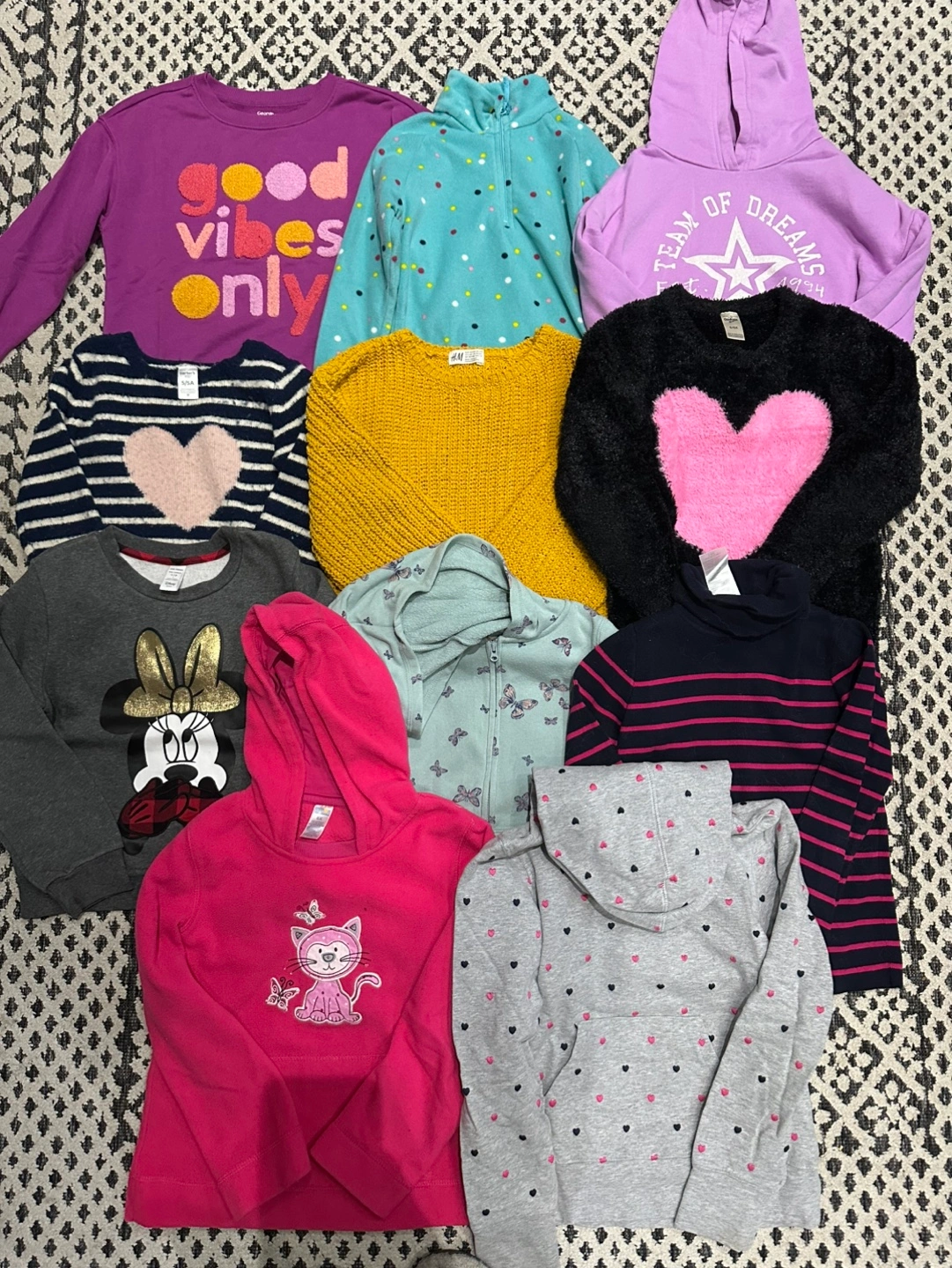 10Assorted girls' sweaters and hoodies. Great condition. Sizes 6-7. Includes pullovers, and hoodies. Various colours and patterns. Perfect for fall and winter.