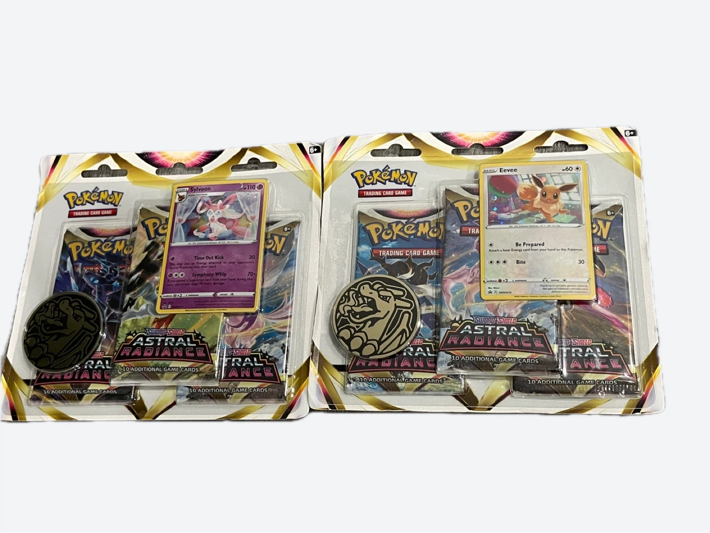 15Selling a bundle of 2 sealed, brand new Astral Radiance 3-pack Blisters. These each contain: * 3 packs of Astral Radiance * 1 Promo Foil Card of either Eevee or Sylveon * A Coin of * A code card for the Pokemon TCG online game Prefer to sell as a bundle but will sell individually for $50 each.