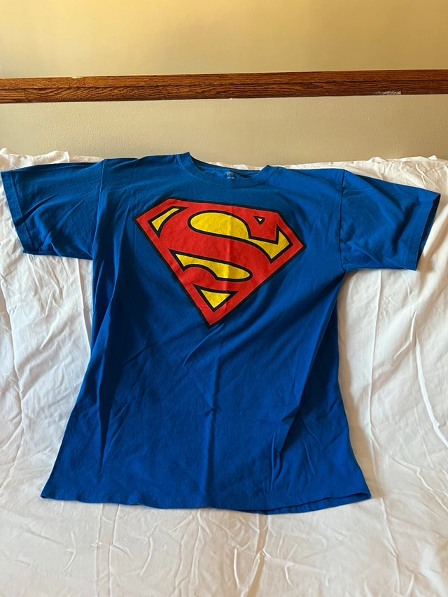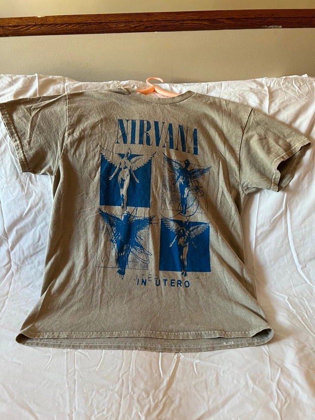 101Here is a collection of band and character t-shirts for sale. They are all used, but in good condition. There is a Nirvana In Utero shirt, Sami Zayn WWE wrestling shirt, Team Moheen shirt, and a Superman shirt. They're all size medium.
