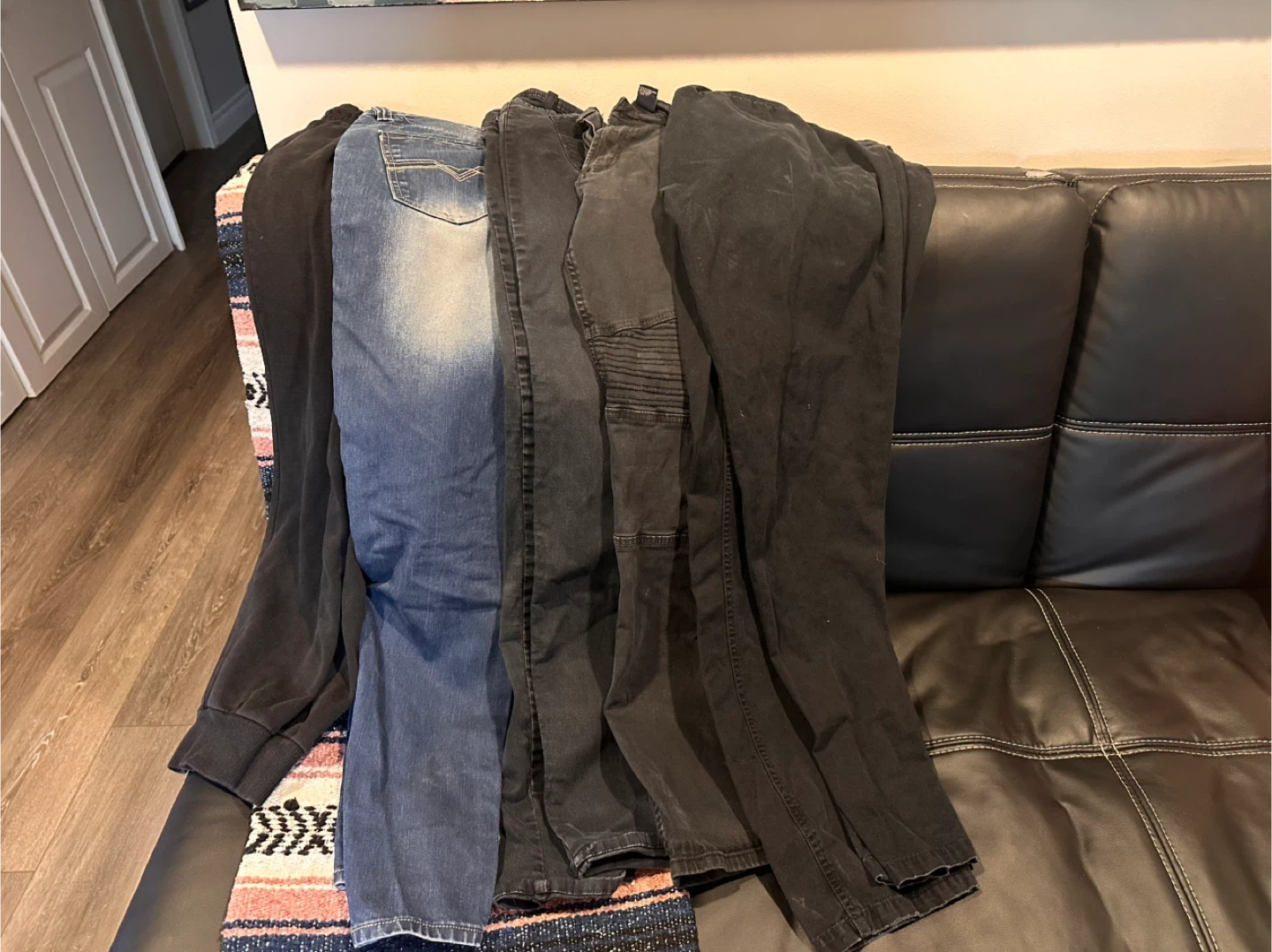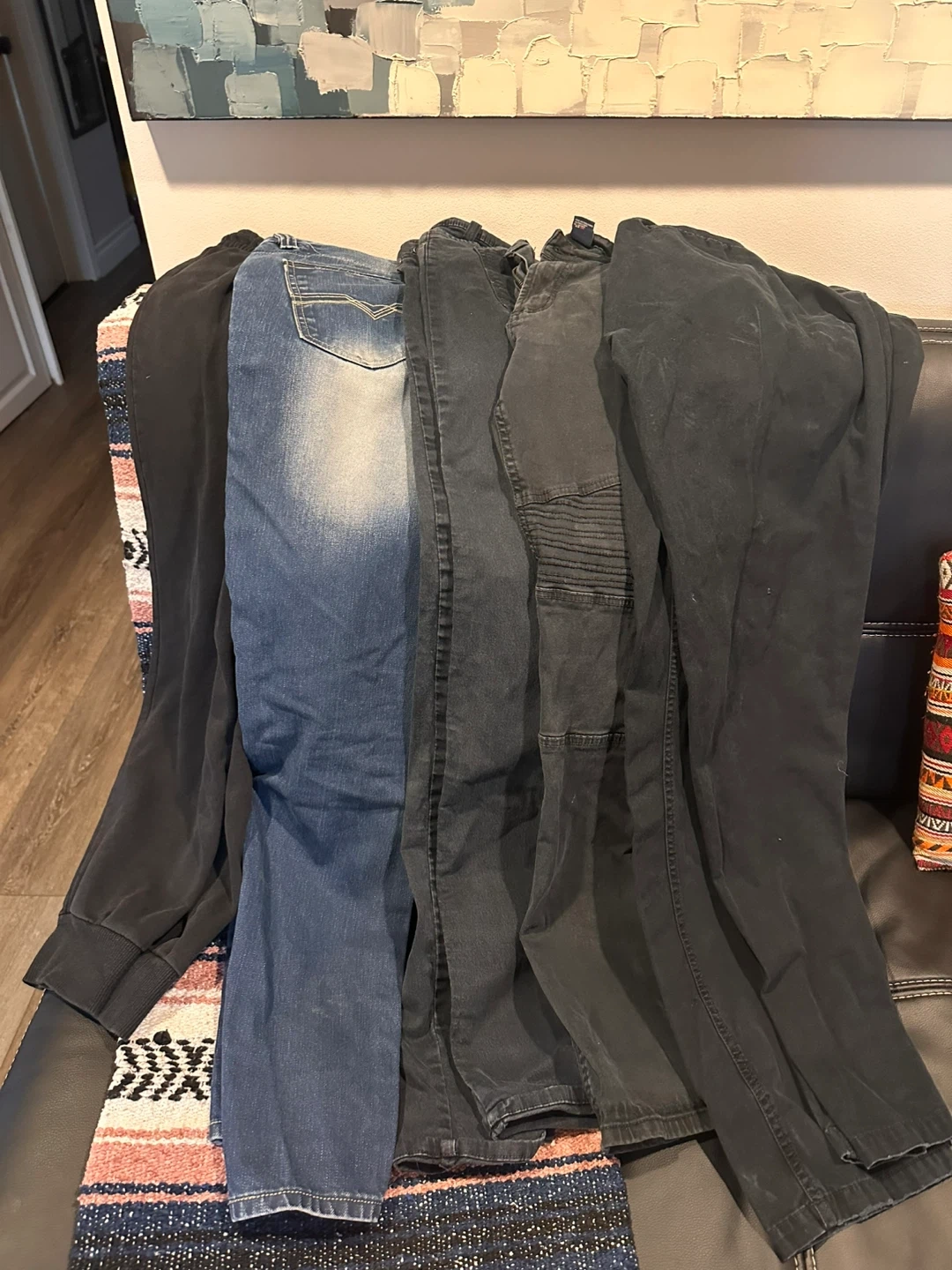 Selling a bundle of jeans and black pants. Includes a pair of blue jeans and three pairs of black pants. Good condition and ready for a new home