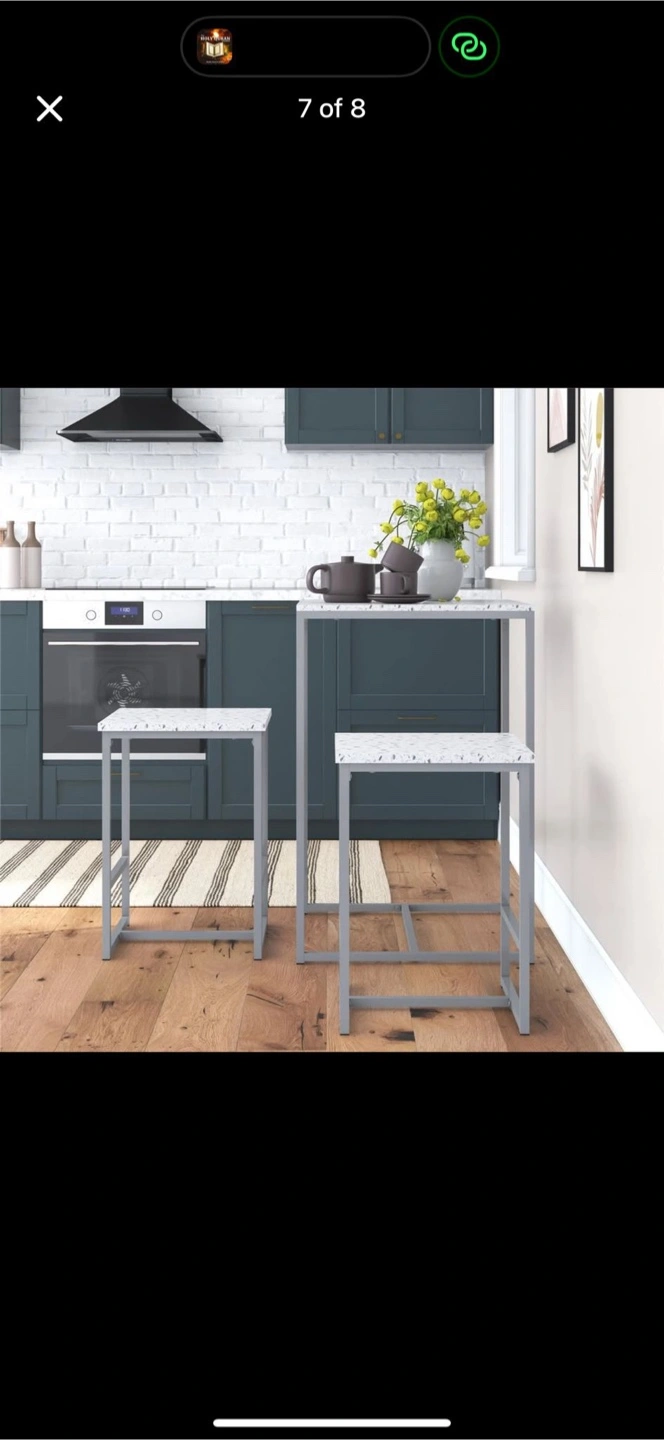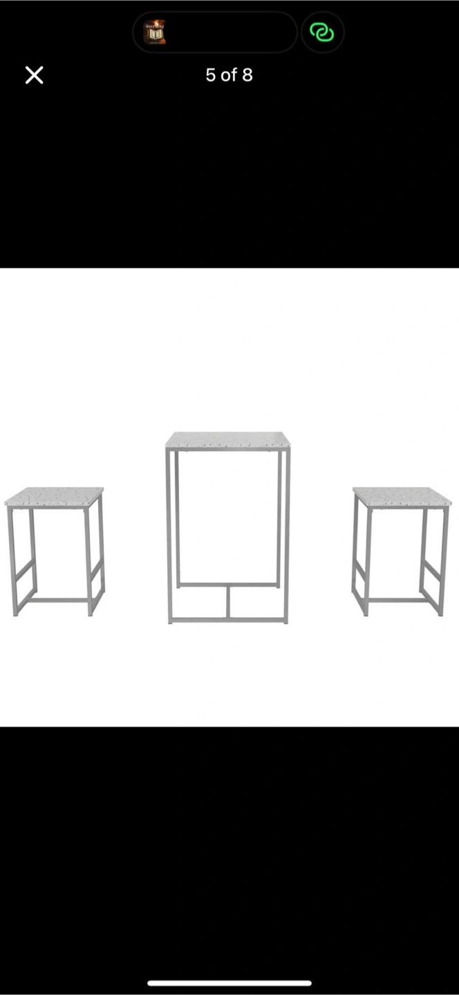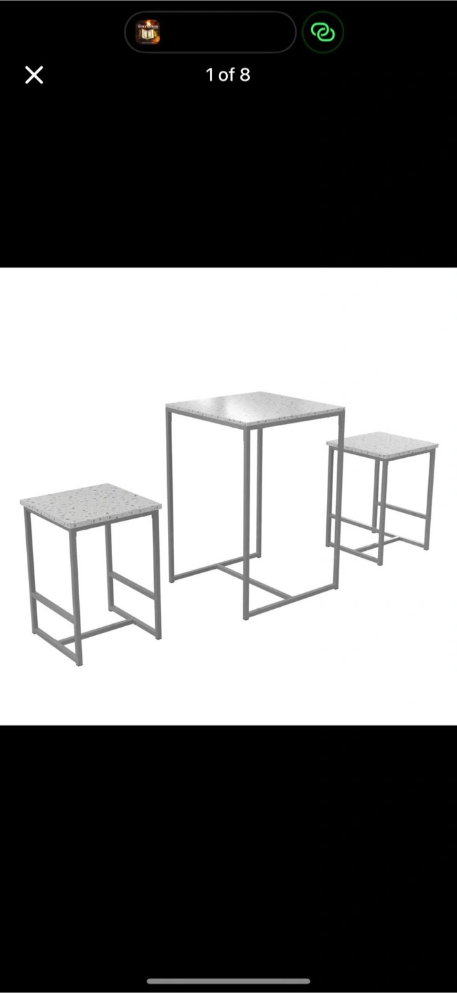 NEW IN BOX Features Modern 3-piece pub set that includes square table with two matching stools. Sturdy gray metal construction with white terrazzo table top and seats. Compact design that is small space living friendly. Perfect addition to your kitchen or dining room. Ships in one box. Quick and easy assembly required. Available in multiple colors. 1-year limited warranty. Product dimensions: Table: 24"L x 24"W x 36"H. Stool: 17"L x 17"W x 24"H. Weight limit: 42 lbs for table top. 250 lbs per stool. Shipping dimensions: 38"L x 27"W x 5"H. Net weight: 45 lbs. Gross weight: 51 lbs. Tiny spaces can have mighty style too, case in point, the Novogratz Bungalow 3-Piece Pub Set. Limited square footage buster extraordinaire, the Bungalow swoops into any snug corner in your designated condo or apartment kitchen and dining bar area to give you a cozy nook to enjoy Sunday morning brunch or catch up with your close pal over some chilled drinks. This modern 3-piece pub set includes a strong black metal frame table and two stools all with laid-back walnut wood finished tops. The ideal trestle style square dining table and seating combo for space saving function, the compact stools neatly tuck in after you've finished your meal. Better yet, the sturdy metal base construction of this dining set ensures that you'll enjoy multiple moments in the best spot in your home. Available in multiple finishes to match your style, there is a Novogratz Bungalow 3-Piece Pub Set with your name on it!