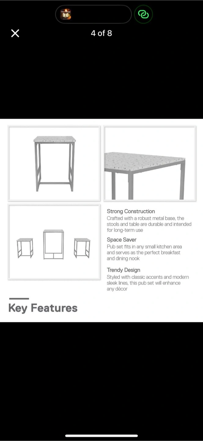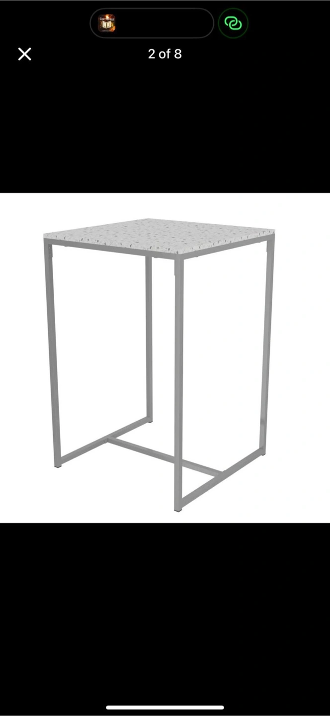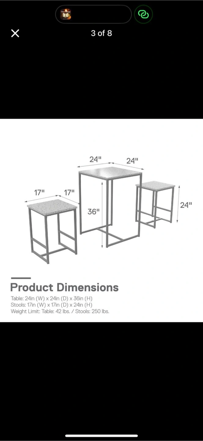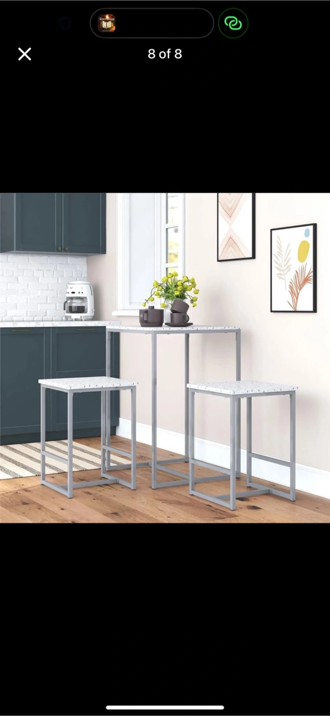 NEW IN BOX Features Modern 3-piece pub set that includes square table with two matching stools. Sturdy gray metal construction with white terrazzo table top and seats. Compact design that is small space living friendly. Perfect addition to your kitchen or dining room. Ships in one box. Quick and easy assembly required. Available in multiple colors. 1-year limited warranty. Product dimensions: Table: 24"L x 24"W x 36"H. Stool: 17"L x 17"W x 24"H. Weight limit: 42 lbs for table top. 250 lbs per stool. Shipping dimensions: 38"L x 27"W x 5"H. Net weight: 45 lbs. Gross weight: 51 lbs. Tiny spaces can have mighty style too, case in point, the Novogratz Bungalow 3-Piece Pub Set. Limited square footage buster extraordinaire, the Bungalow swoops into any snug corner in your designated condo or apartment kitchen and dining bar area to give you a cozy nook to enjoy Sunday morning brunch or catch up with your close pal over some chilled drinks. This modern 3-piece pub set includes a strong black metal frame table and two stools all with laid-back walnut wood finished tops. The ideal trestle style square dining table and seating combo for space saving function, the compact stools neatly tuck in after you've finished your meal. Better yet, the sturdy metal base construction of this dining set ensures that you'll enjoy multiple moments in the best spot in your home. Available in multiple finishes to match your style, there is a Novogratz Bungalow 3-Piece Pub Set with your name on it!