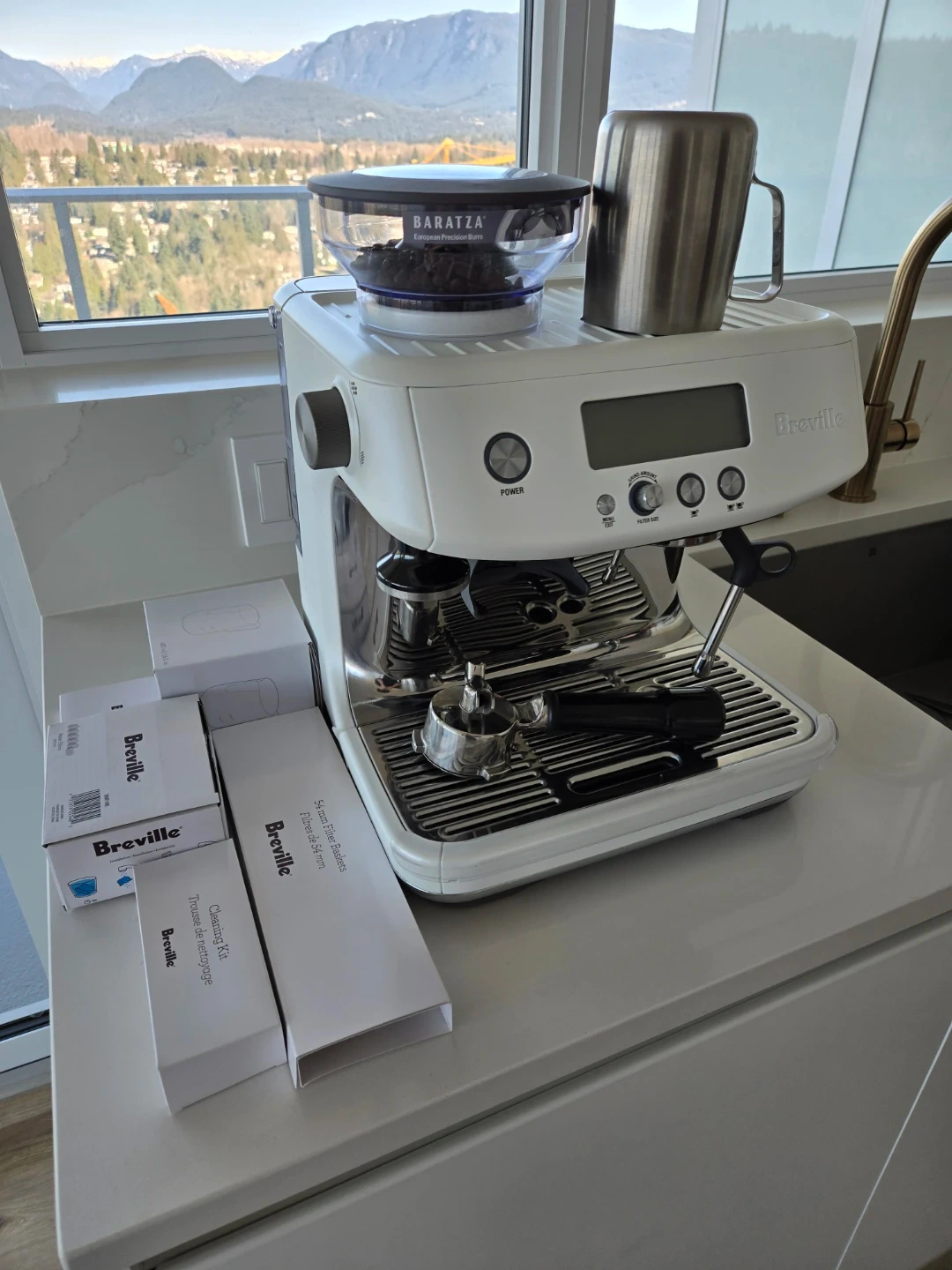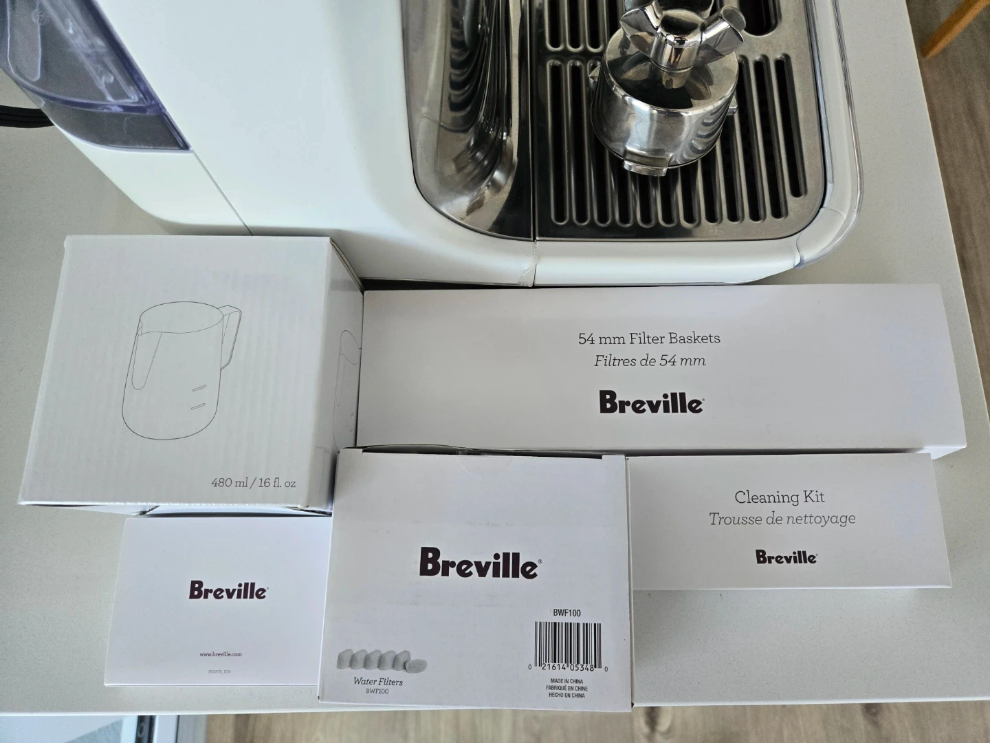 Breville white espresso machine complete with a Baratza grinder and various additional accessories. Includes 54mm filter baskets, water filters, and a cleaning kit.