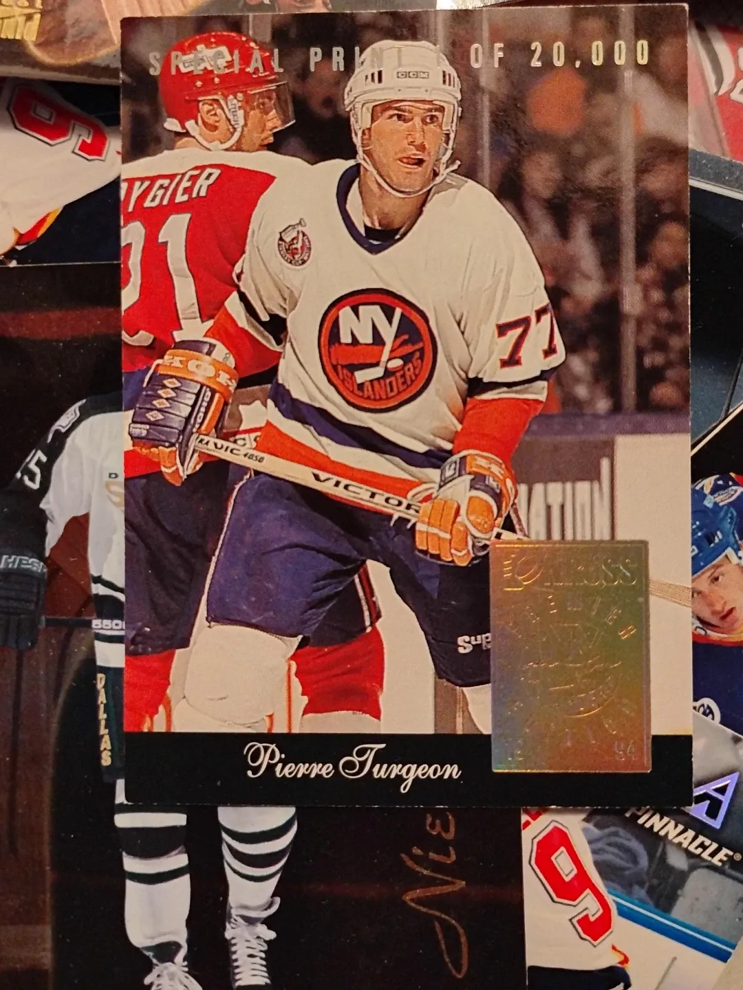 This is a 1994 Pinnacle hockey card featuring Pierre Turgeon of the New York Islanders. It's a special print of 20,000. The card includes a foil insert.