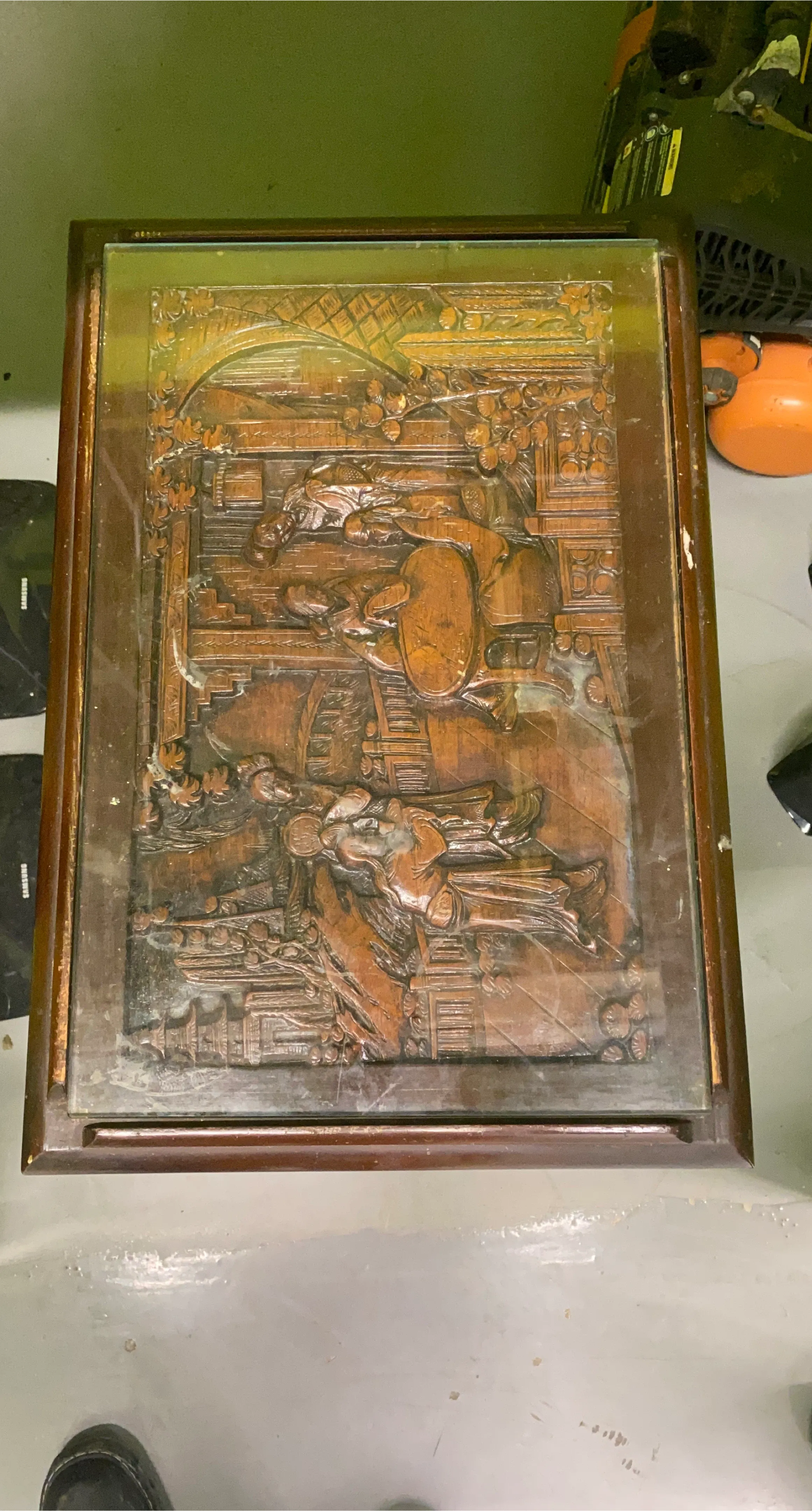 A decorative carved wood panel featuring a detailed scene. It's enclosed in a wooden frame with a glass top. The carving depicts figures and architectural elements.