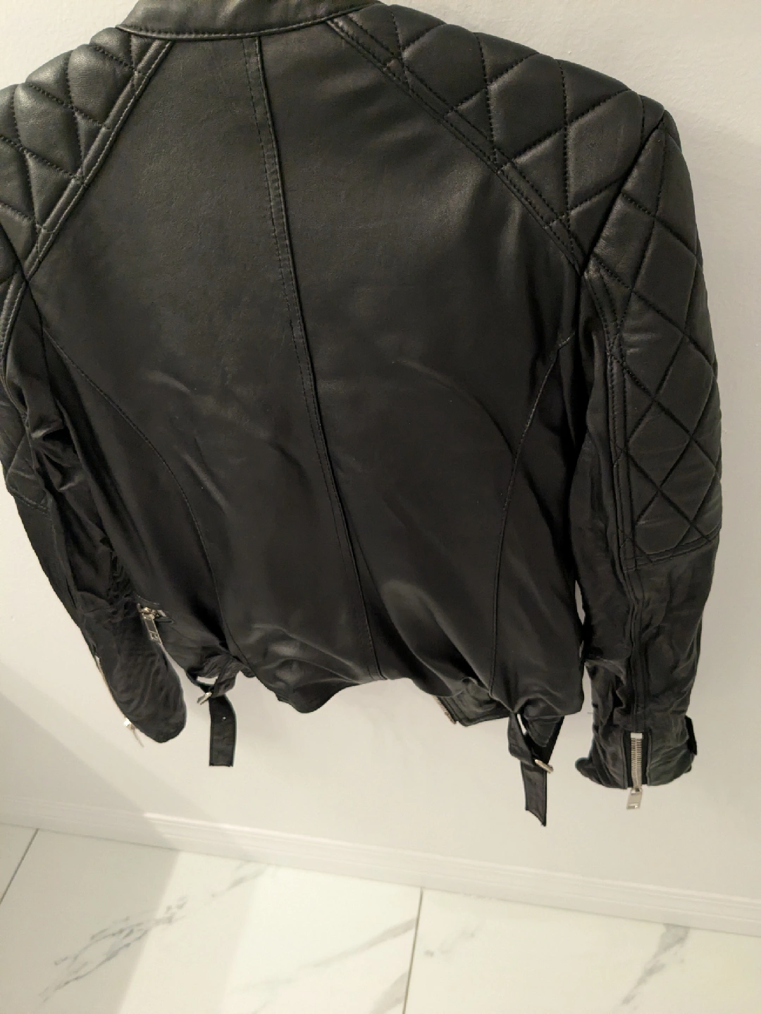 231Selling a stylish black leather jacket from Burberry. It's made of 100% lambskin leather, with a lining of cotton and viscose. Perfect for adding a touch of class to any outfit! Authentic Size 4 Excellent condition pickup only cash please