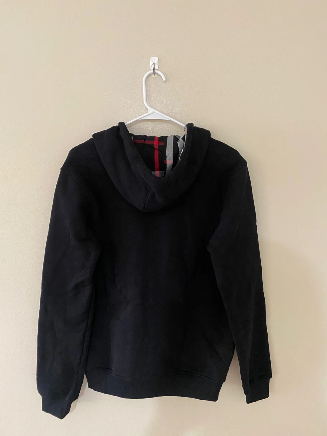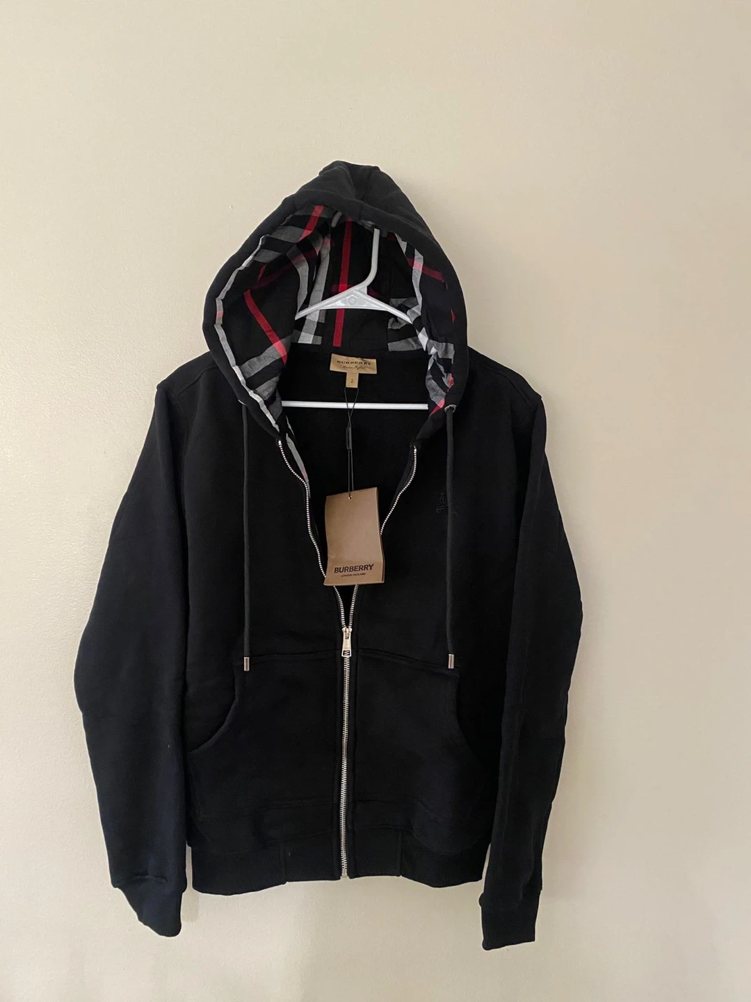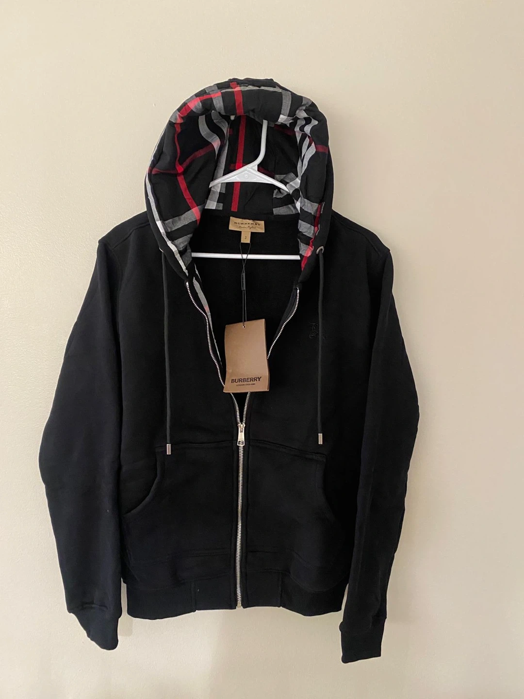 10Selling a brand new Burberry black zip-up hoodie in size XL! It features a stylish plaid pattern on the inside of the hood. Perfect for adding a touch of luxury to your everyday look