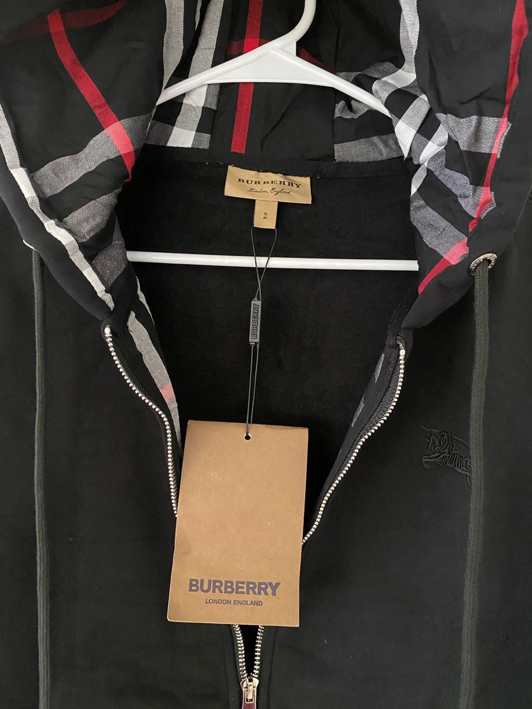 10Selling a brand new Burberry black zip-up hoodie in size XL! It features a stylish plaid pattern on the inside of the hood. Perfect for adding a touch of luxury to your everyday look