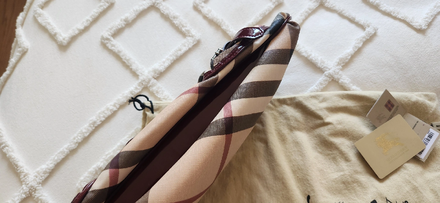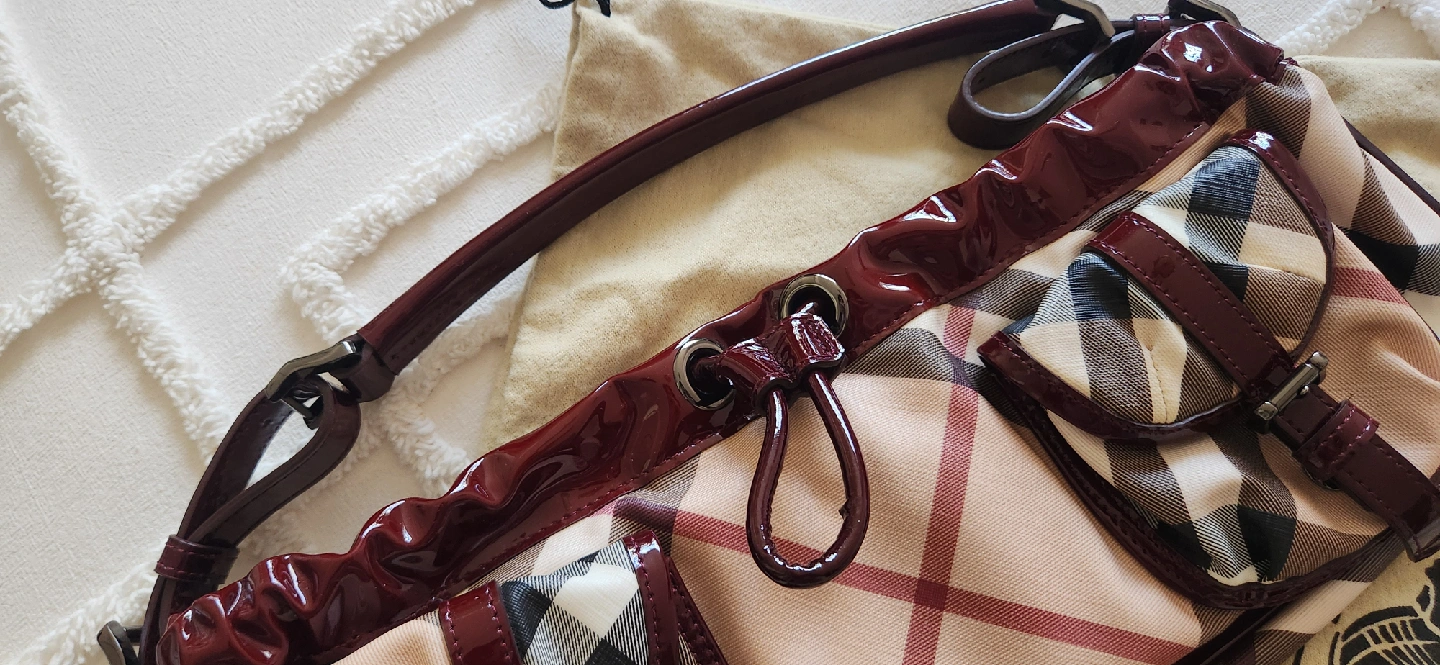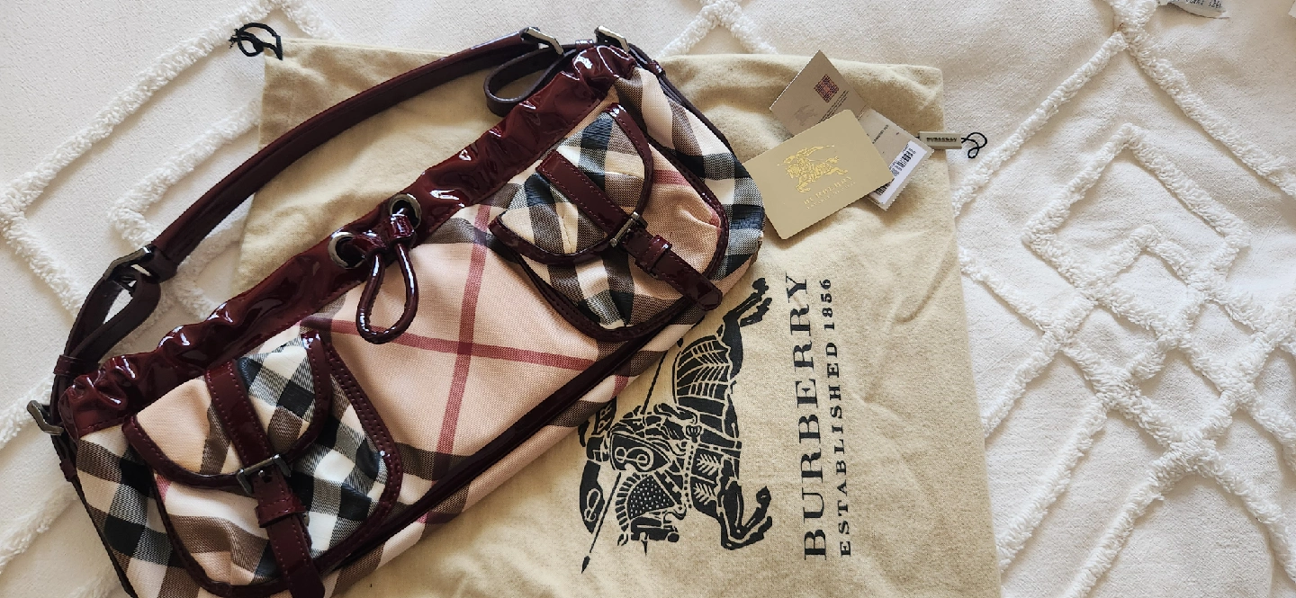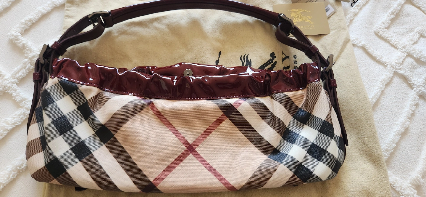 Pre-owned Burberry handbag. Burgundy patent leather trim. Beige and brown checked pattern. Multiple pockets. Shoulder strap.