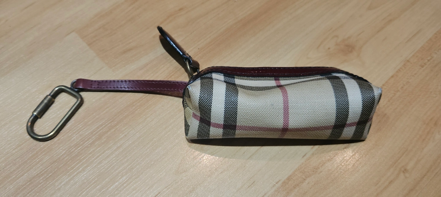 Adorable mini pouch. Features Burberry check pattern and a dark maroon leather trim. Includes a convenient carabiner clip. Perfect for keys or small essentials.
