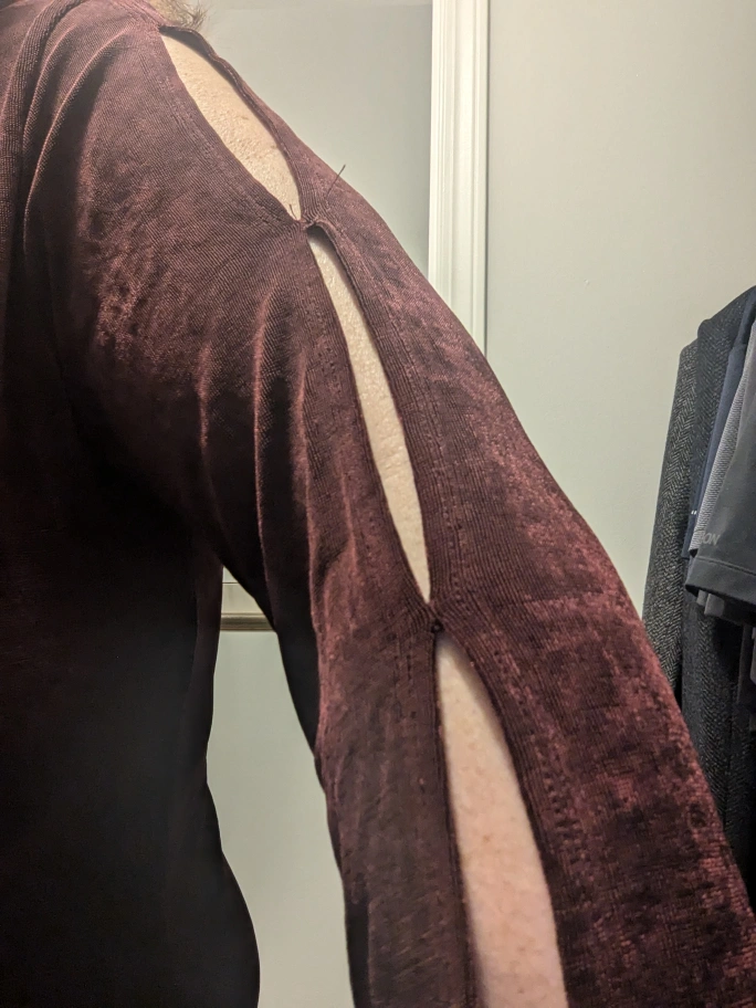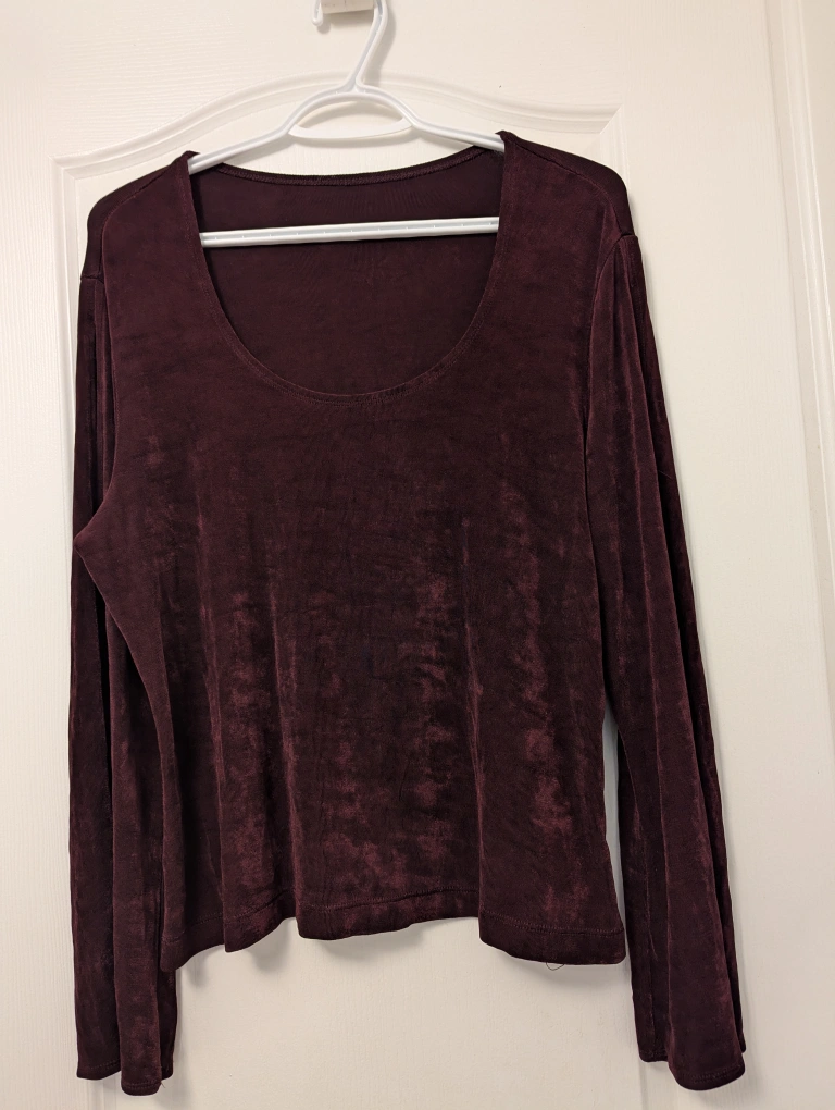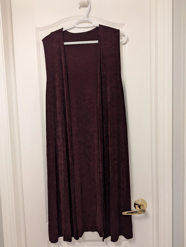 Burgundy 2-piece set. Top is a fitted 3/4 sleeve and the vest is sleeveless with an open front. Both pieces are a very soft, stretchy (slinky) fabric. The top has openings in the sleeves. The vest looks great over black leggings.