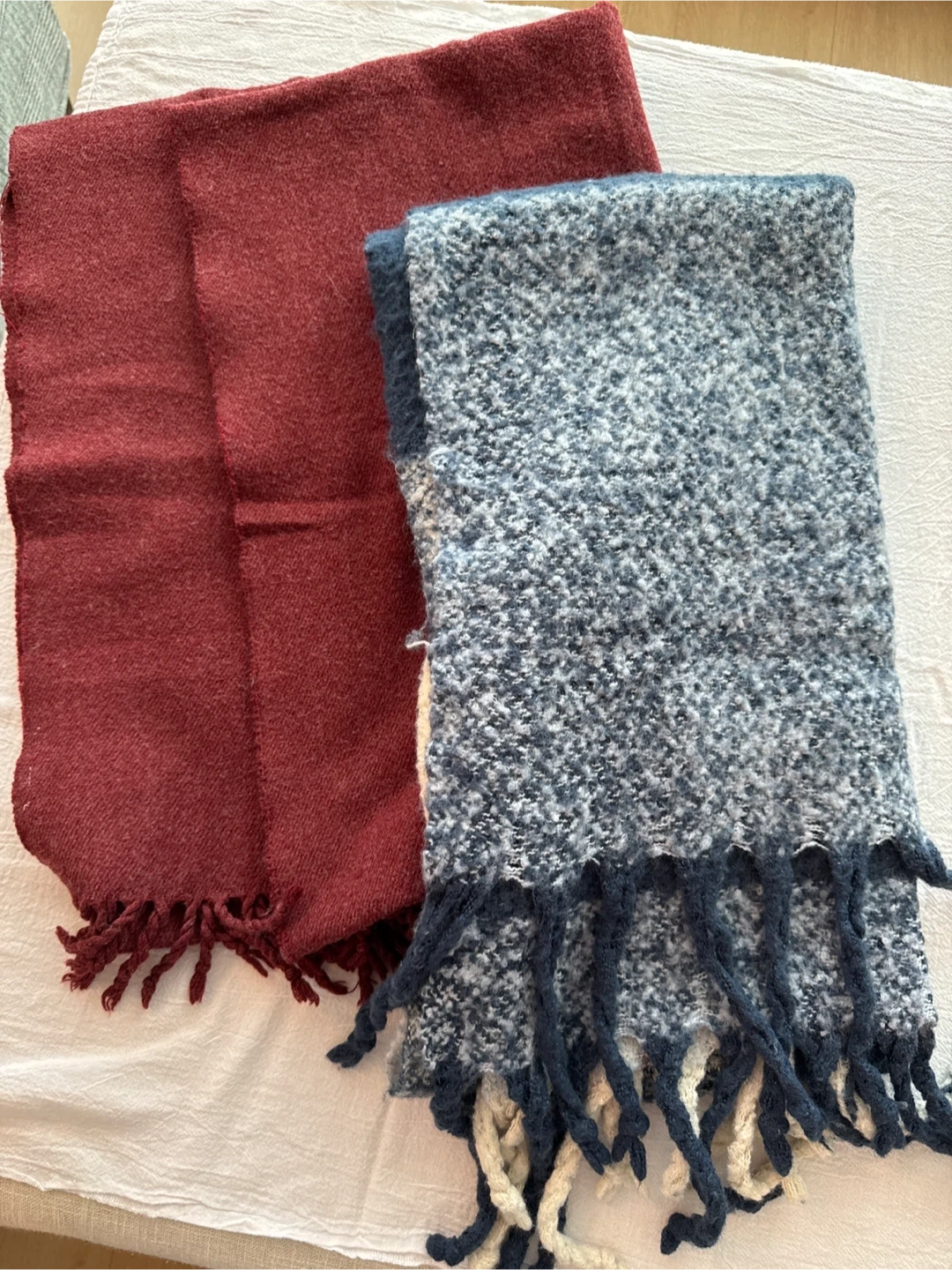 70Selling two cozy winter scarves! One is a solid burgundy colour and the other is a blue and white mix with navy fringe. Perfect for keeping warm this winter season.