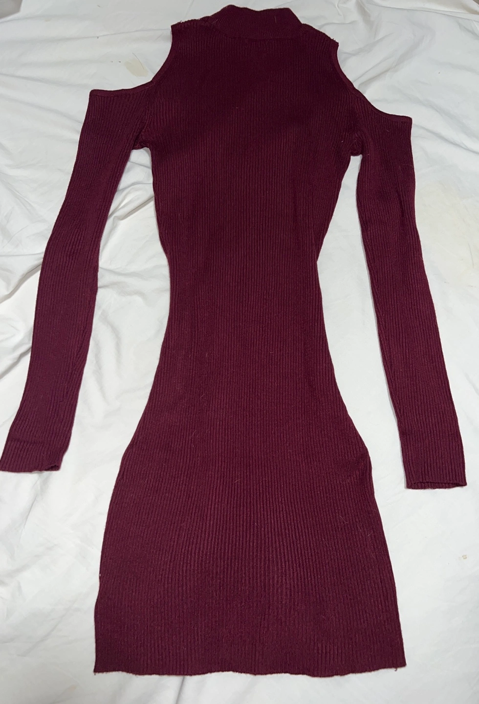 Long sleeve mini dress. Ribbed knit material. Cold shoulder detail. Mock neck.