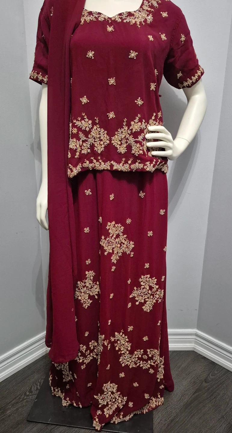 10Beautiful burgundy dress with intricate gold embroidery. Perfect for special occasions or adding a touch of elegance to your wardrobe. It's in great condition and ready for a new home!