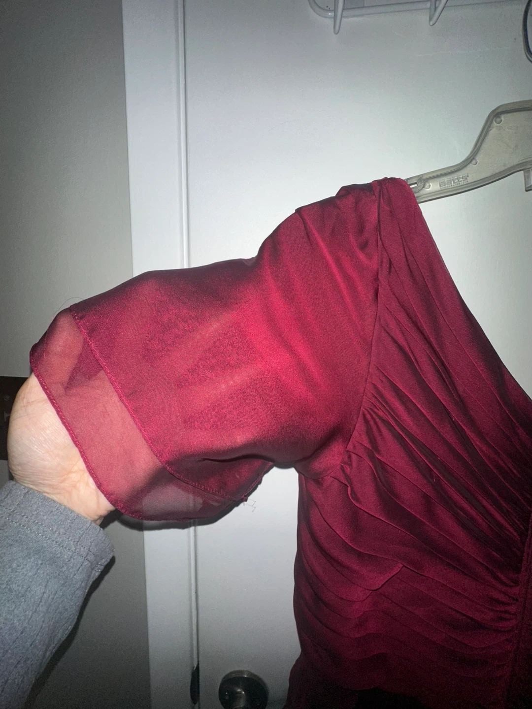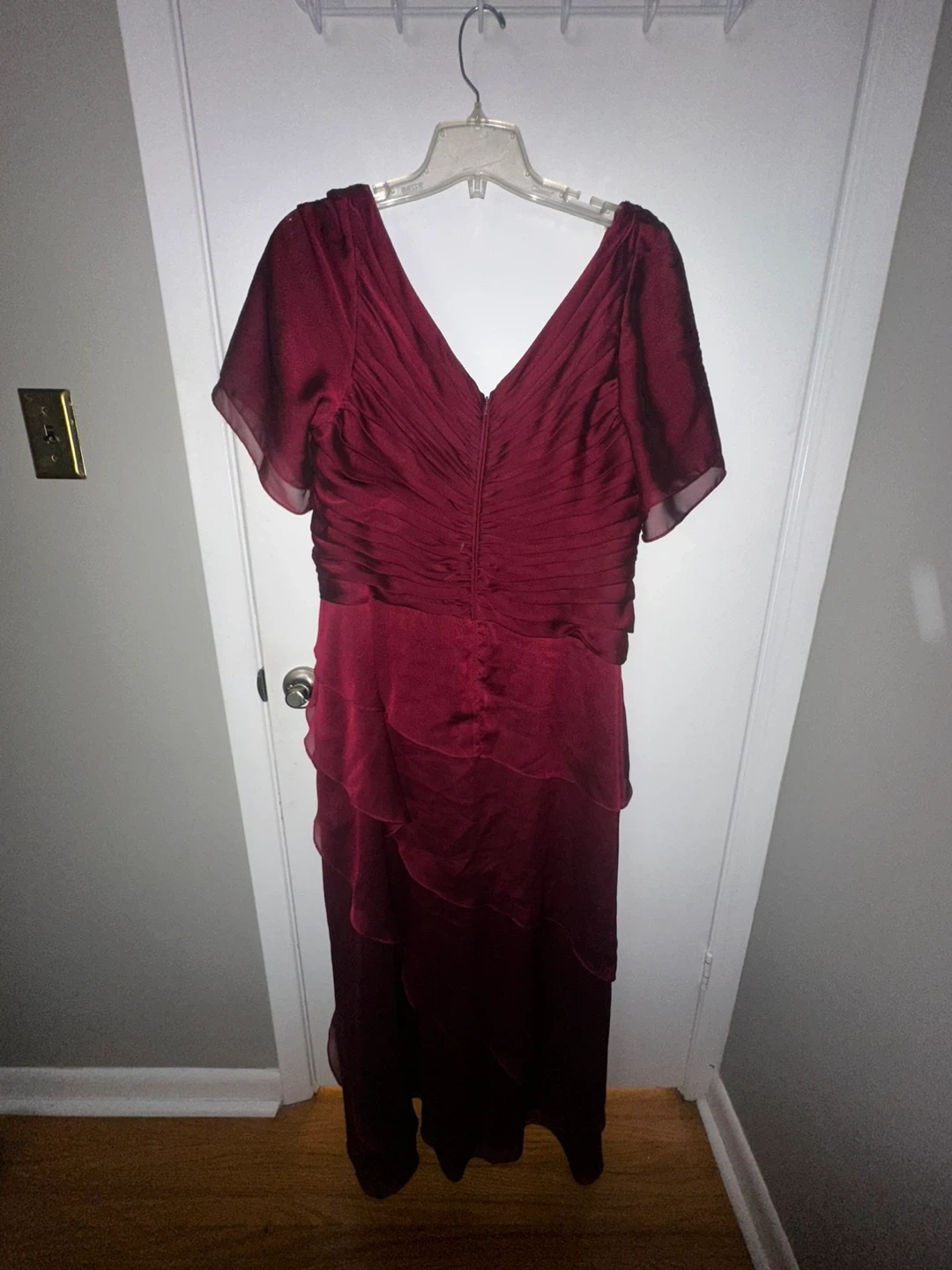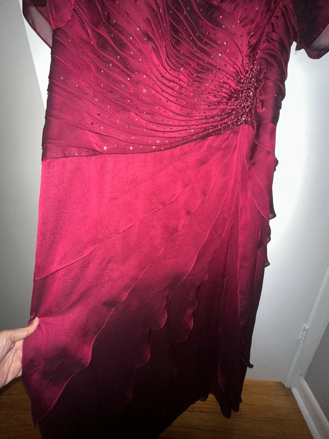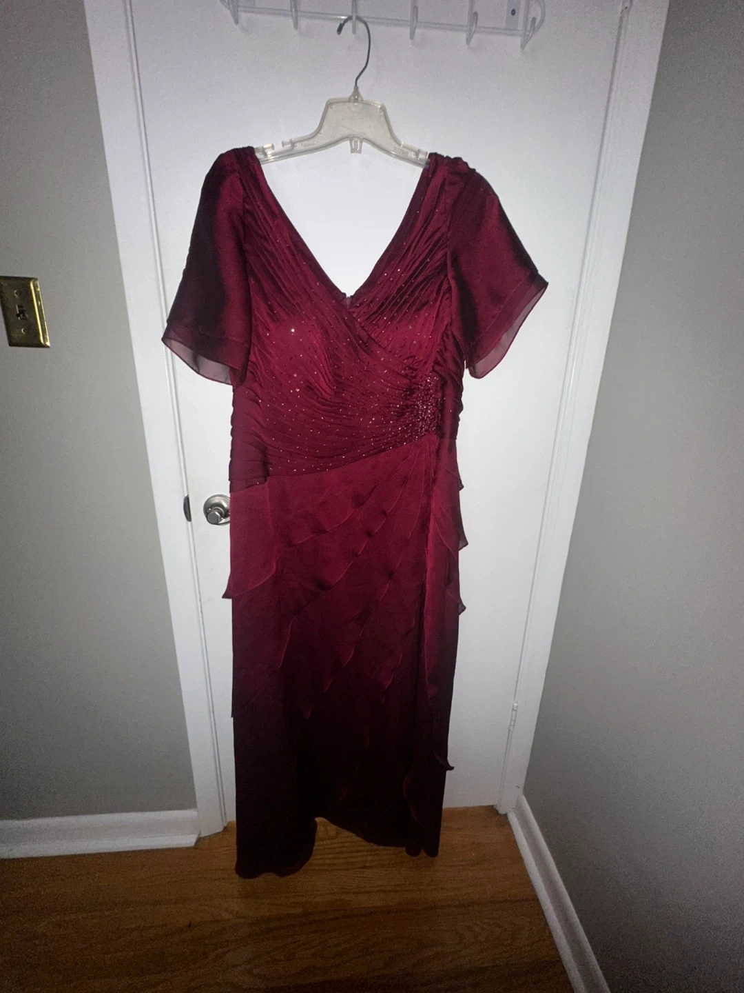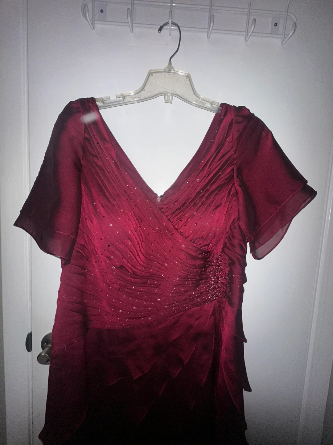 15Selling a beautiful burgundy formal dress. It has a V-neck and short, sheer sleeves. The dress features a layered skirt and some embellishments on the bodice. Perfect for a special occasion!