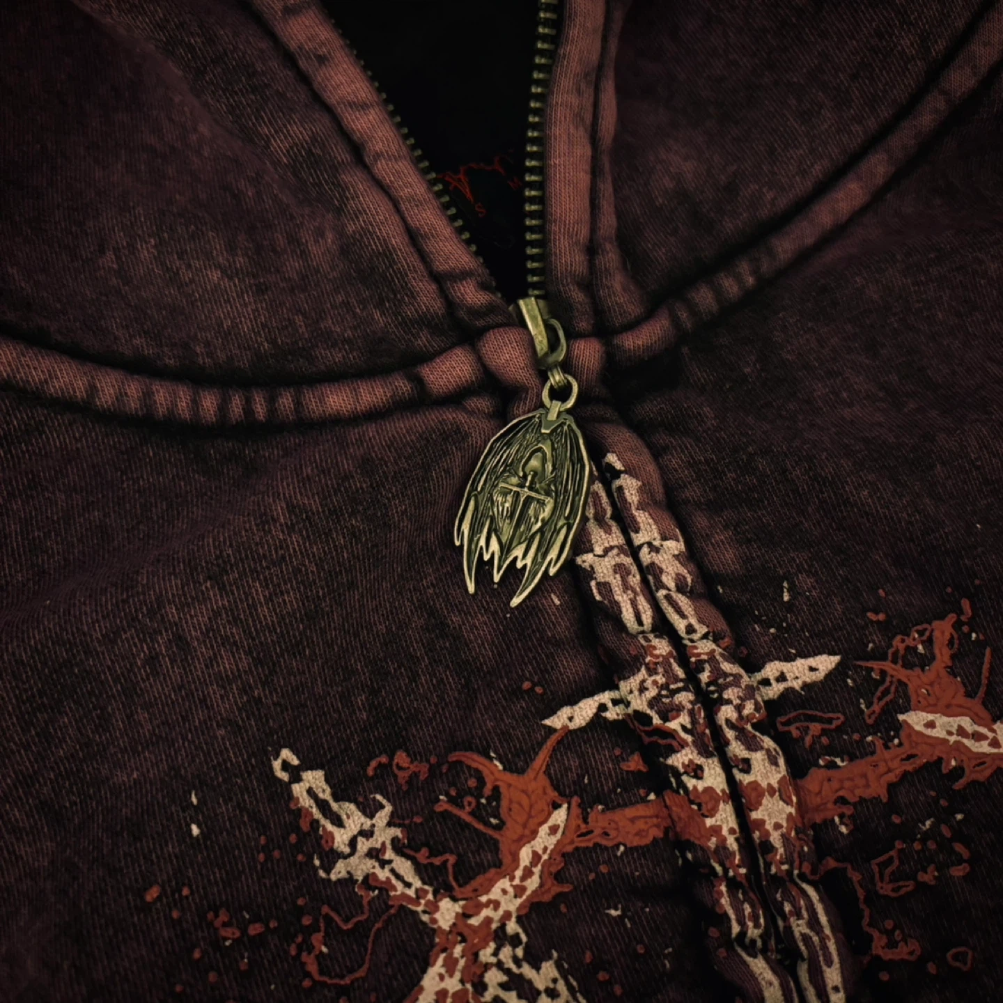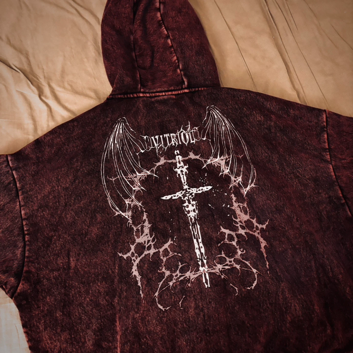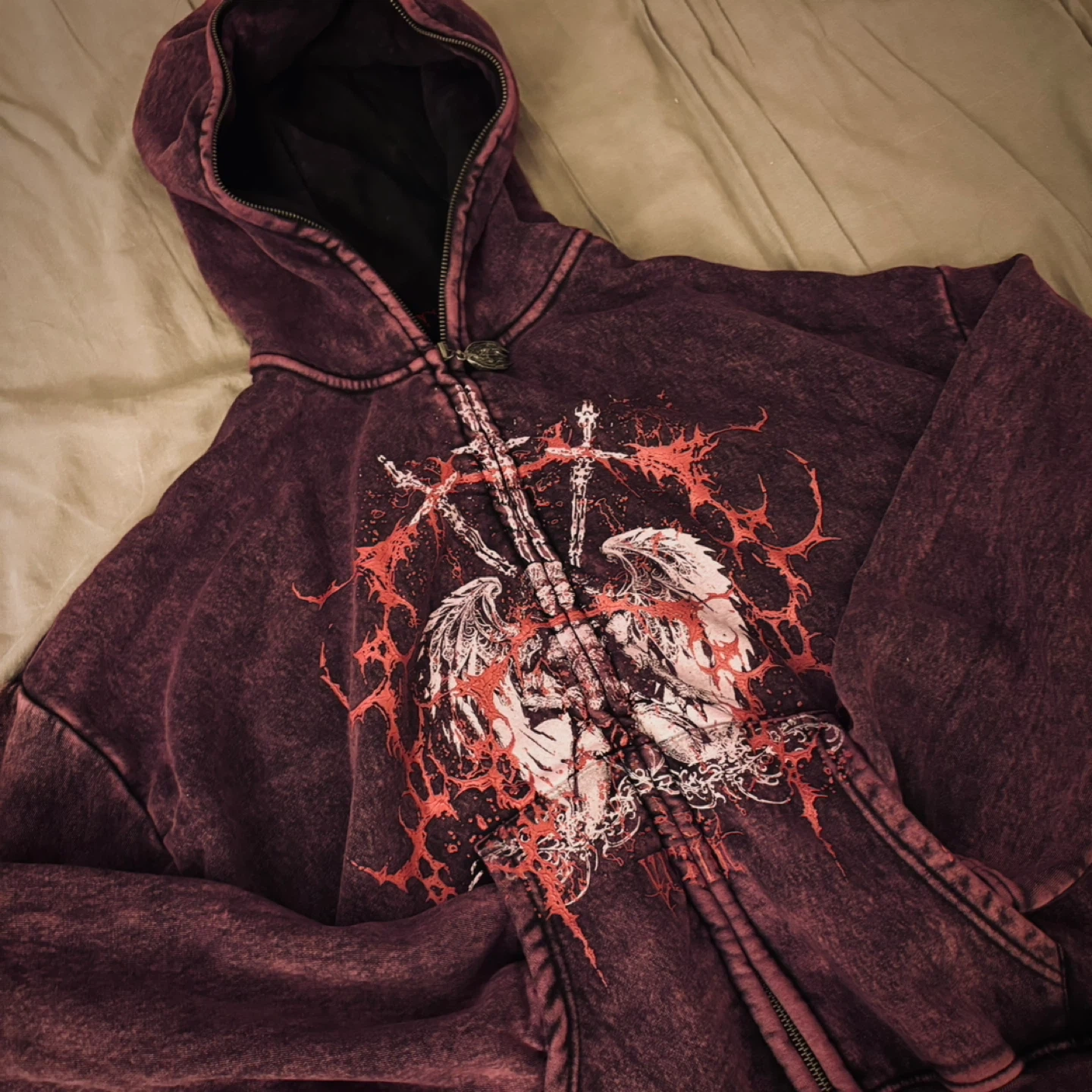 42Selling a hoodie with a cool graphic design! It's a burgundy colour and has a unique zipper pull charm. Perfect for adding some edge to your wardrobe!