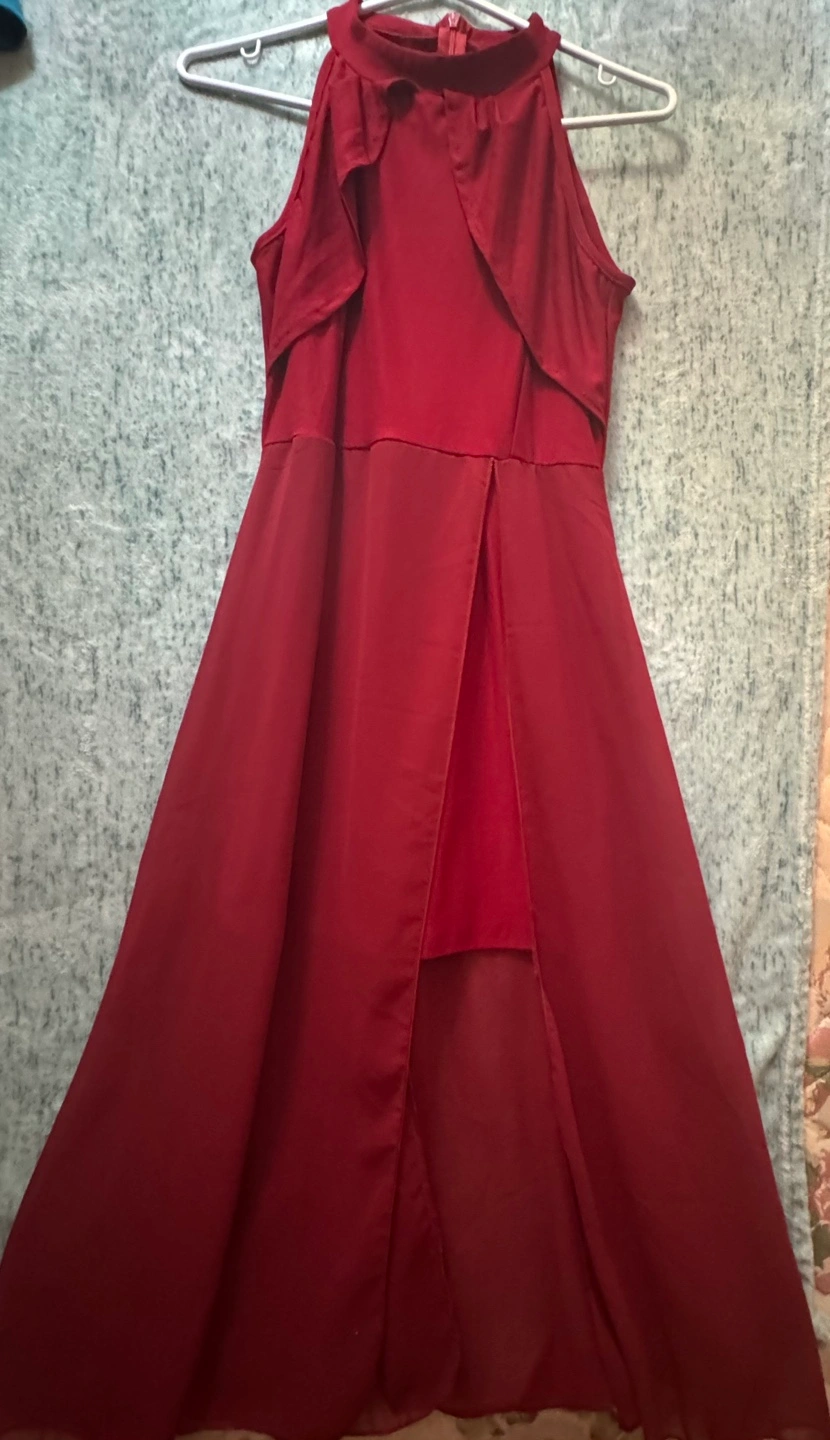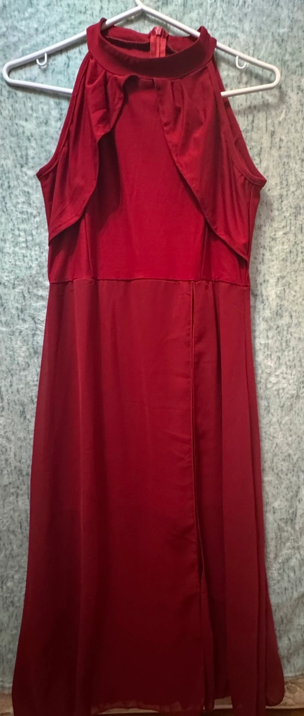 Stunning burgundy dress. Halter neck, sleeveless, midi length. Features a front slit and ruffle detail. Perfect for a special occasion.For pick up only