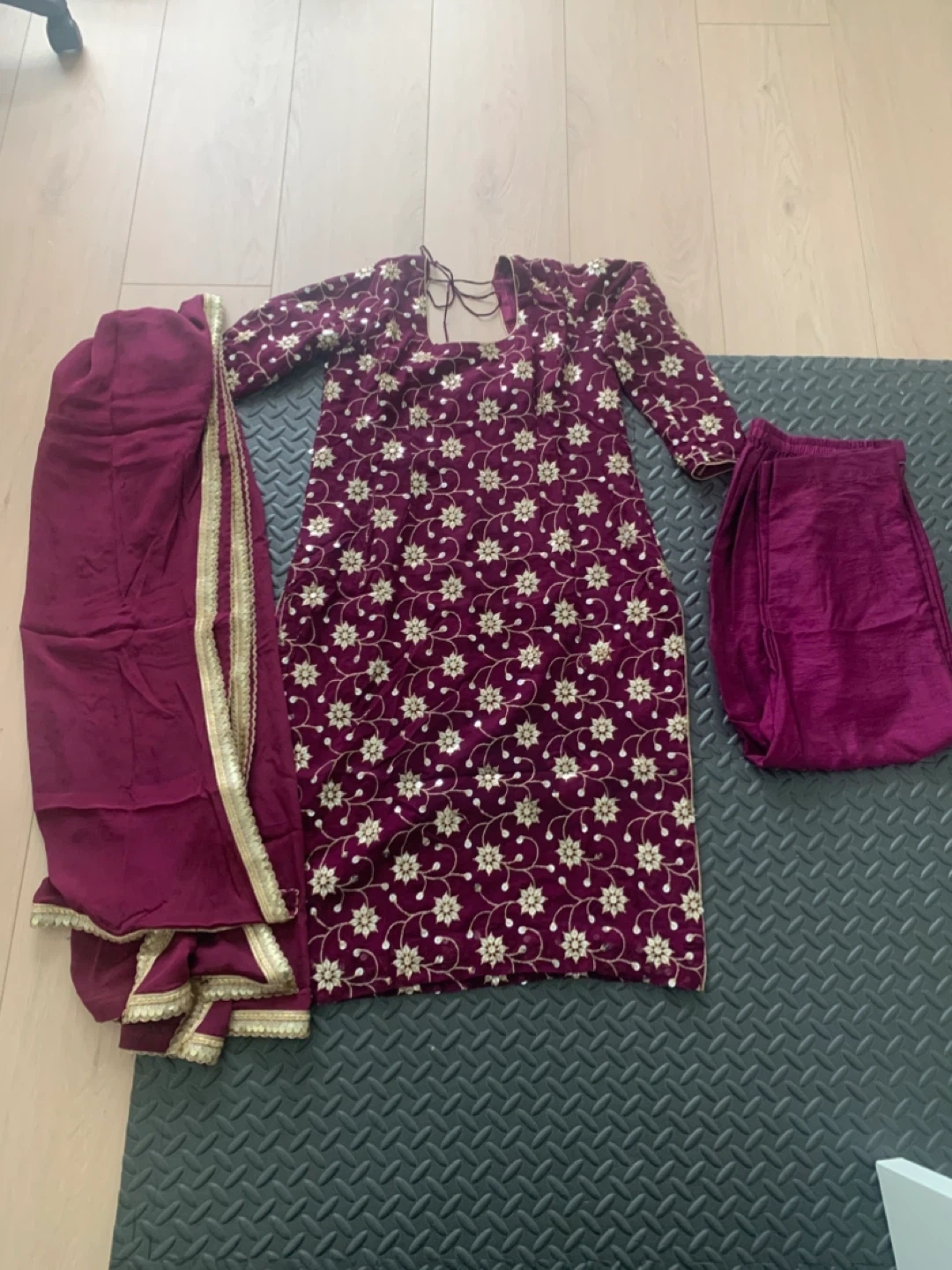 10Selling a beautiful burgundy pant suit. It includes the kameez (top), salwar (pants), and dupatta (scarf). The kameez has a lovely floral pattern embroidered on it. Perfect for a special occasion!