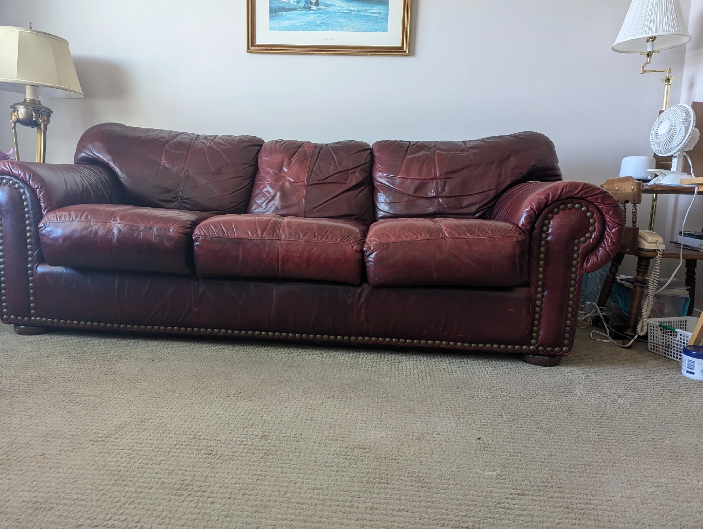 10Looking to sell this comfy burgundy leather sofa. It's a great piece and has a classic look with the studded trim. It shows some signs of wear, but it's still in good condition and ready for a new home. ACCEPTING CASH ONLY $50