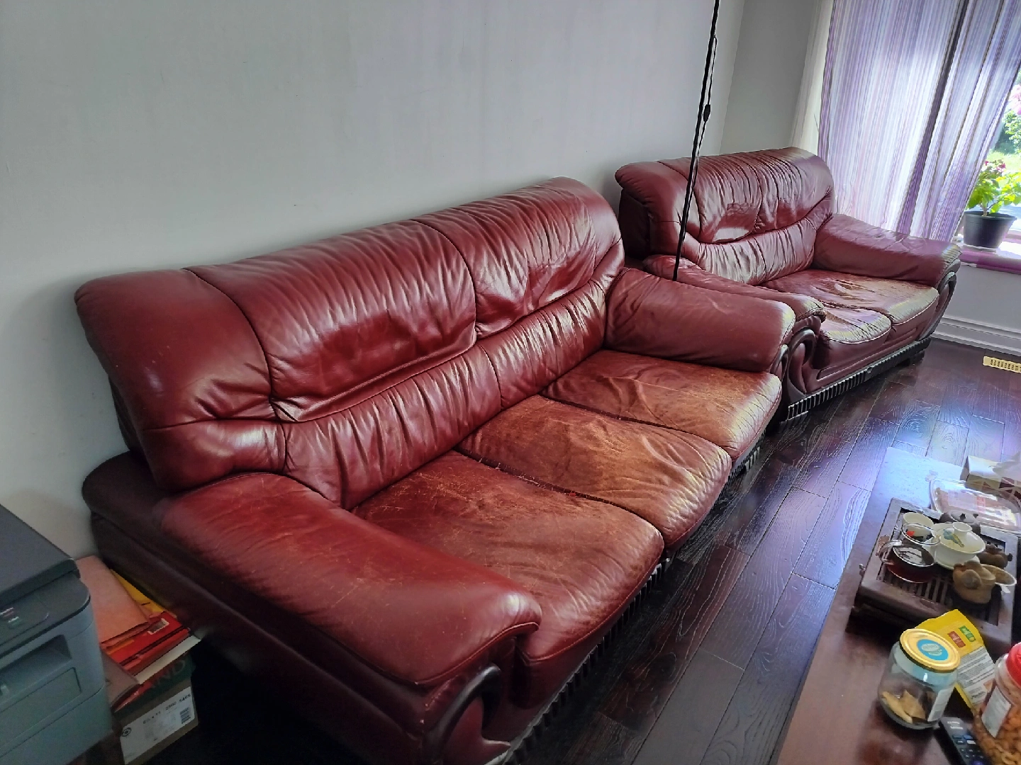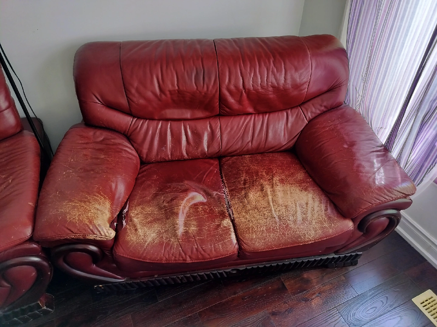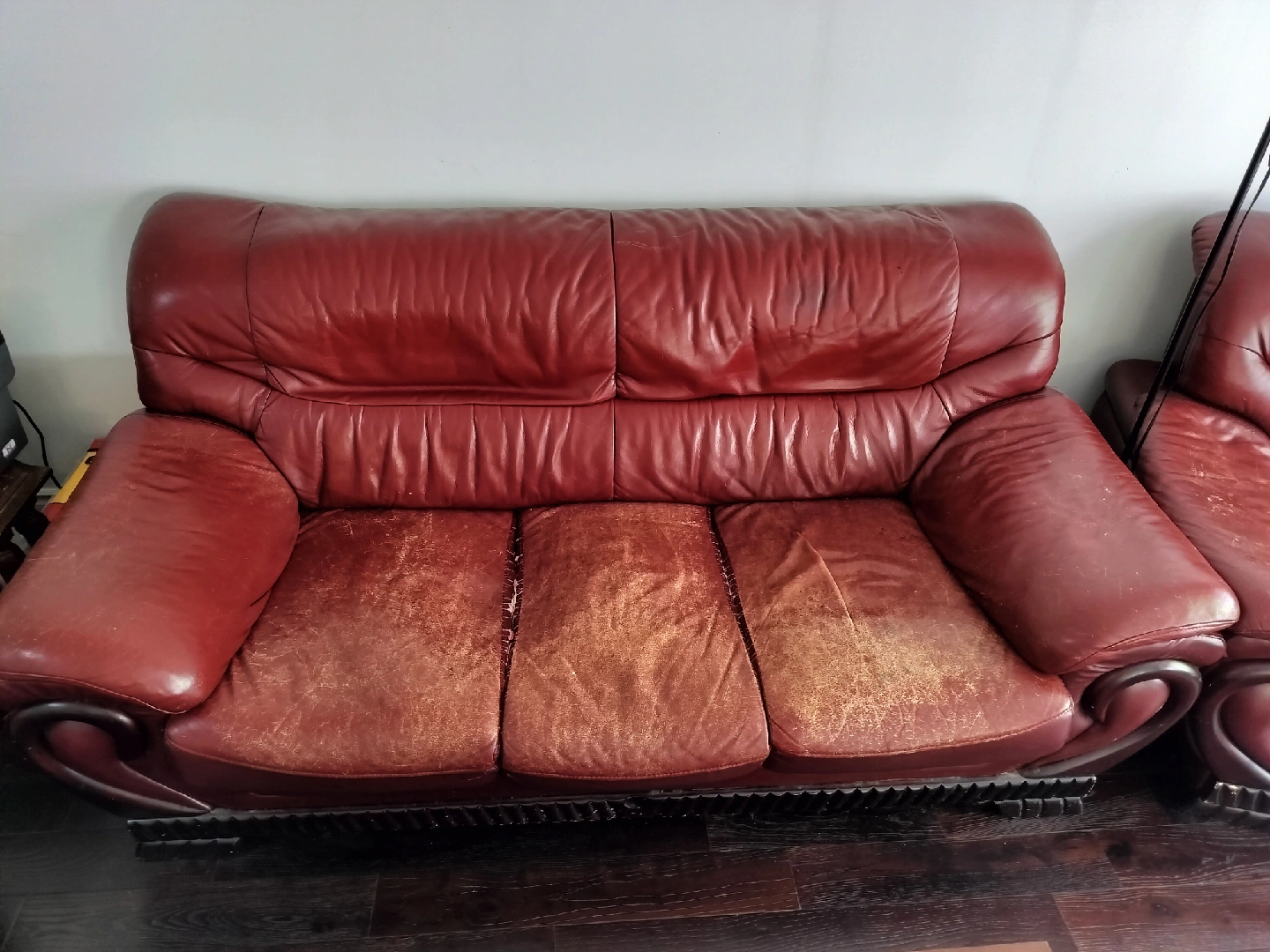 Selling a burgundy leather sofa and loveseat set. They're in used condition with some wear, as you can see in the photos. Still a comfy set for a living room or den! You need to pick up.