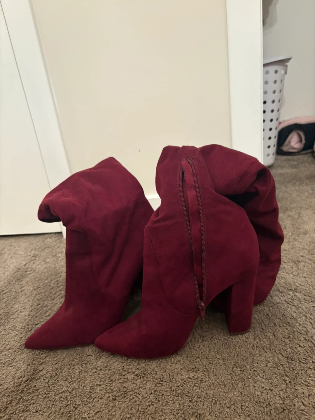10Selling a pair of burgundy over-the-knee boots! They're in great shape and ready for a new home. The colour is a rich burgundy, perfect for adding a pop of colour to any outfit. They feature a heel and a sleek design, making them a stylish choice for any occasion