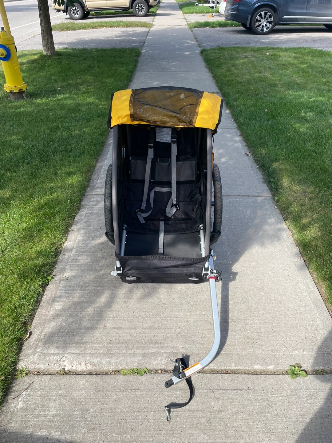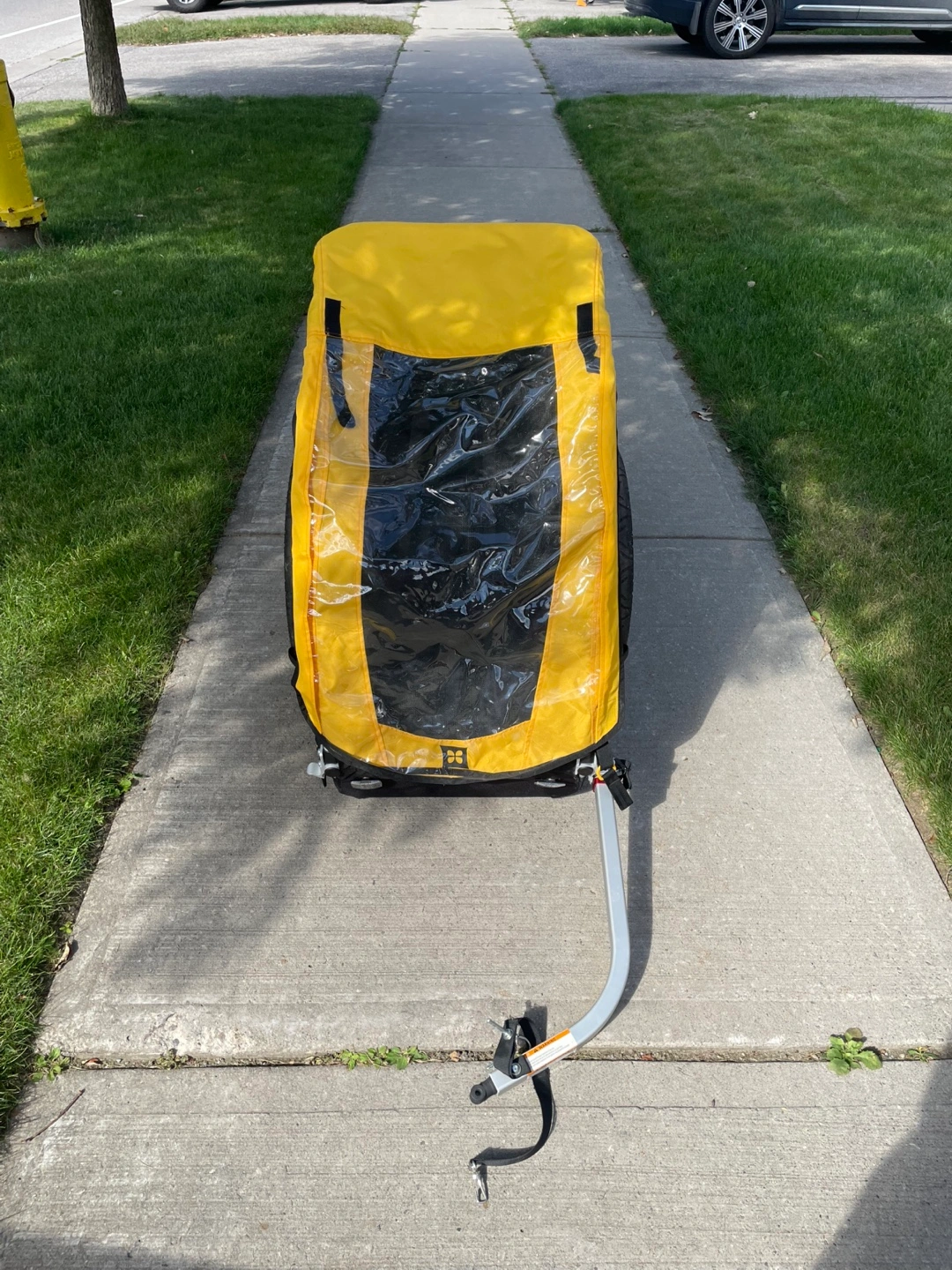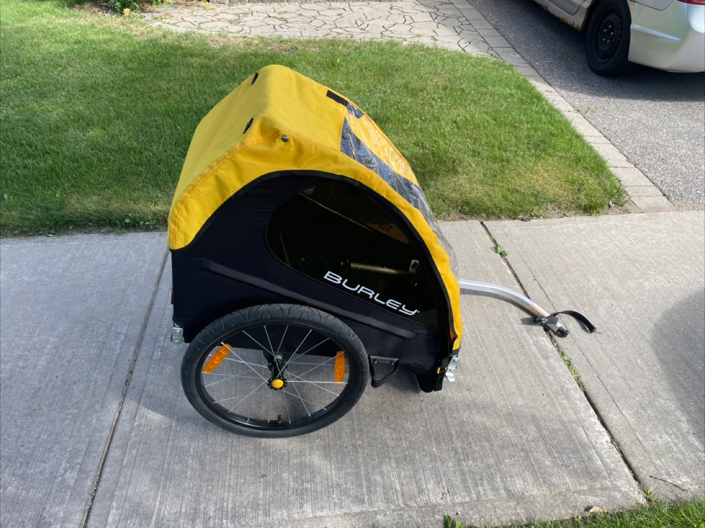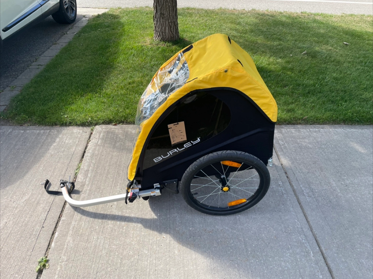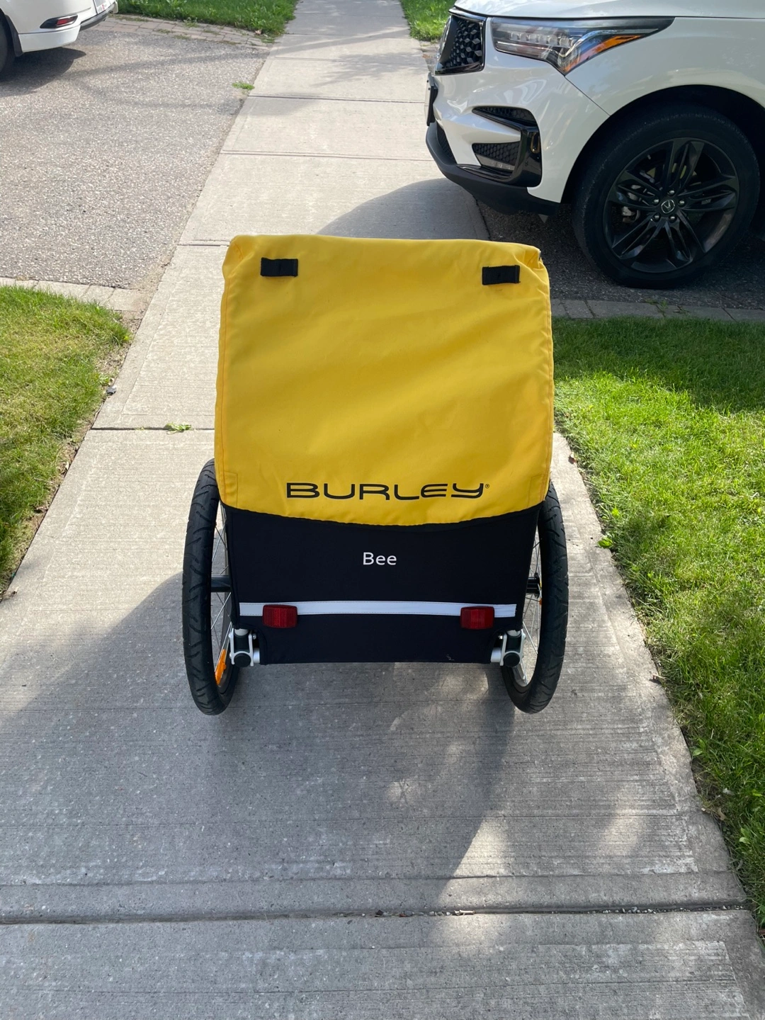 Selling a Burley Bee Child Bike Trailer in excellent condition! This sturdy and reliable trailer is a safe and fun way to bring your little one along for bike rides. It comes in bright yellow and black, designed for one child, and is perfect for family outings and adventures. I’m also including accessories for free: a high-quality lighting set and two adapter, both are like new(valued at about $100)Everything is clean, well-maintained