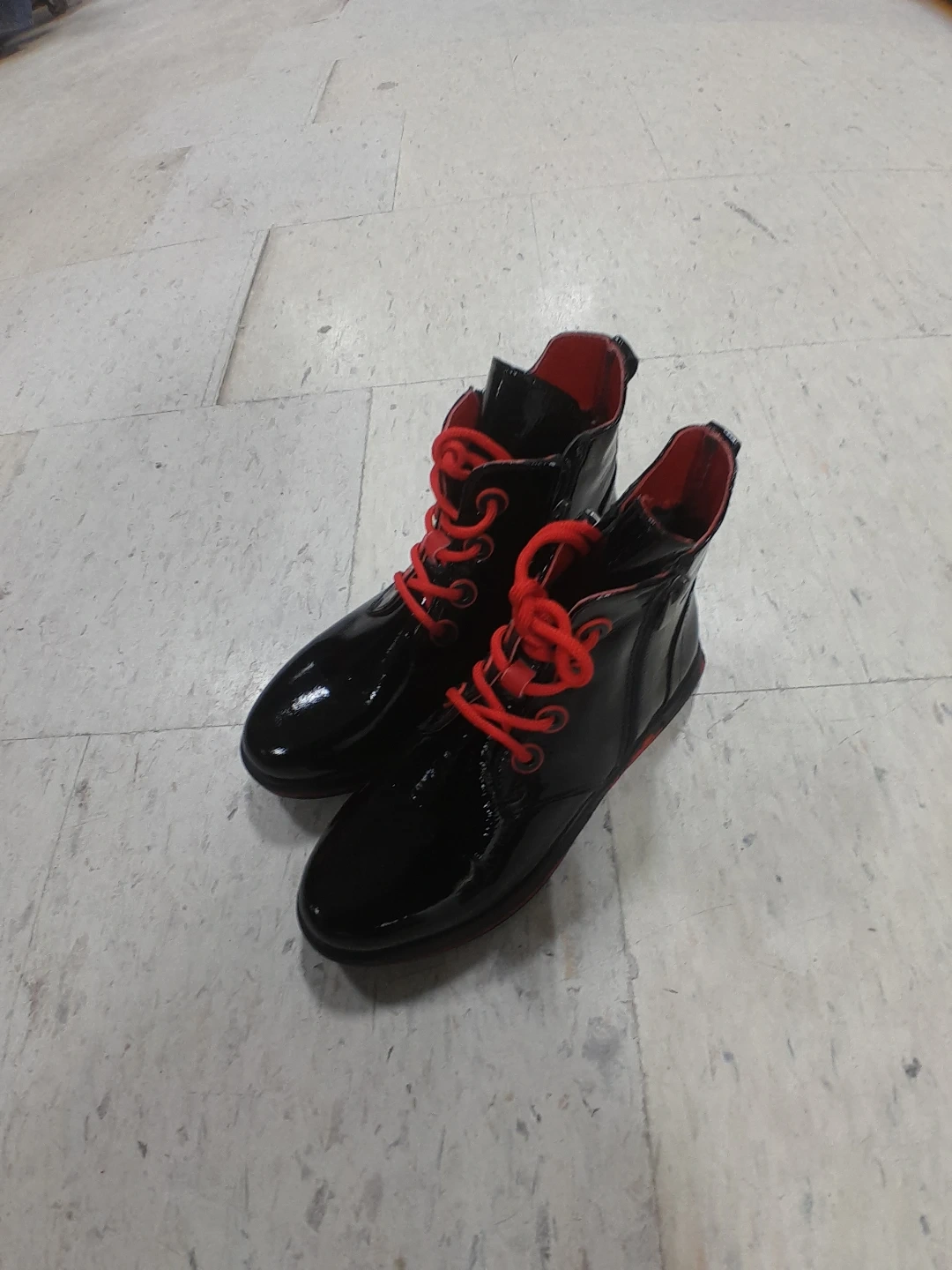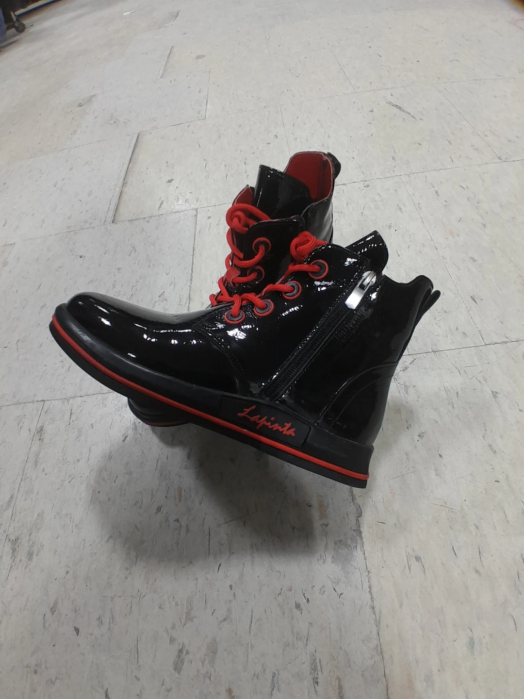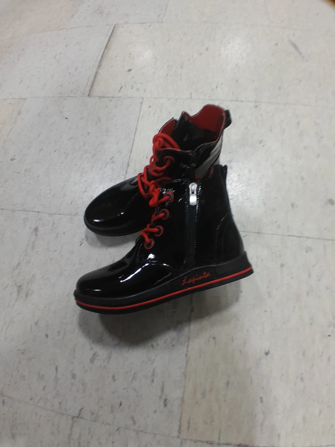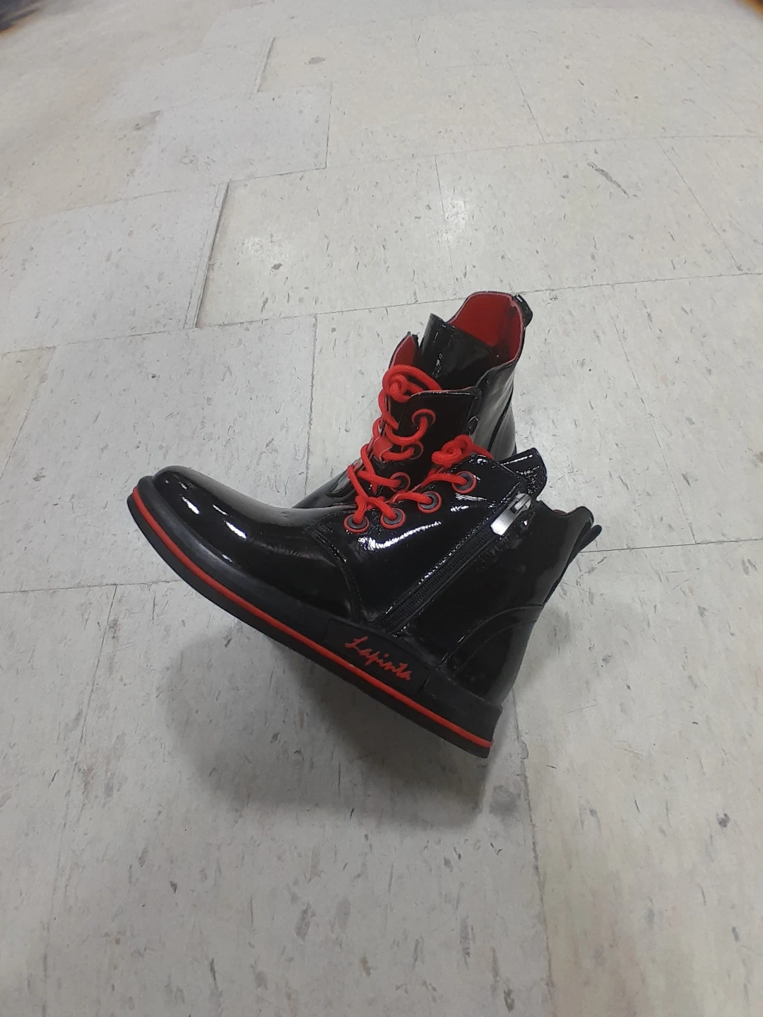 Stylish black patent boots with bold red laces and lining. These ankle boots feature a side zipper for easy wear. They have a sleek, shiny finish perfect for adding flair to any outfit original La Pinta women's Size 6.5