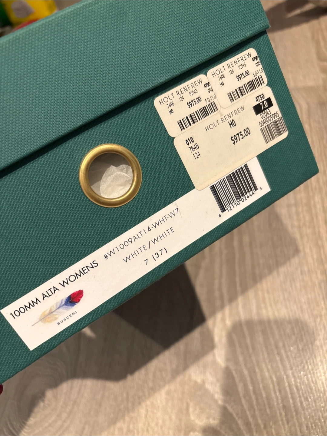 10Selling a pair of Buscemi 100MM Alta women's sneakers in white, size 7. They come with the original box. The box has a Holt Renfrew price tag of $975 on it.