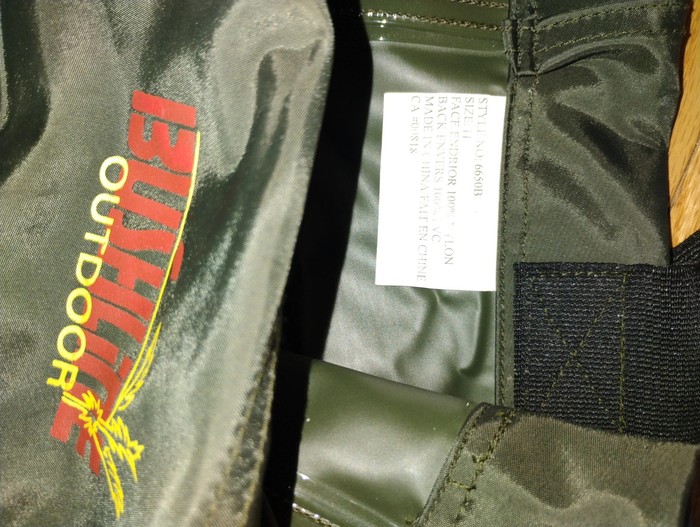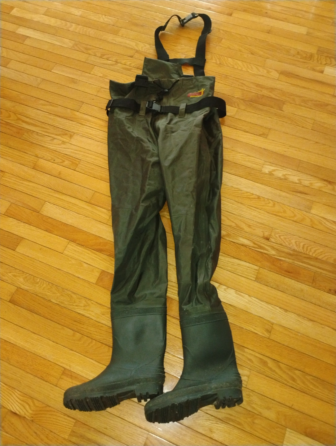 10Green chest-high waders. Attached boots. Adjustable straps. Good for fishing or other outdoor activities. Size 11.