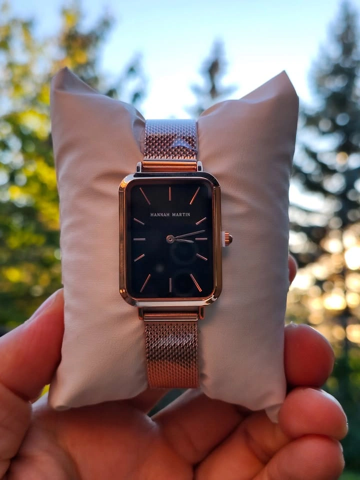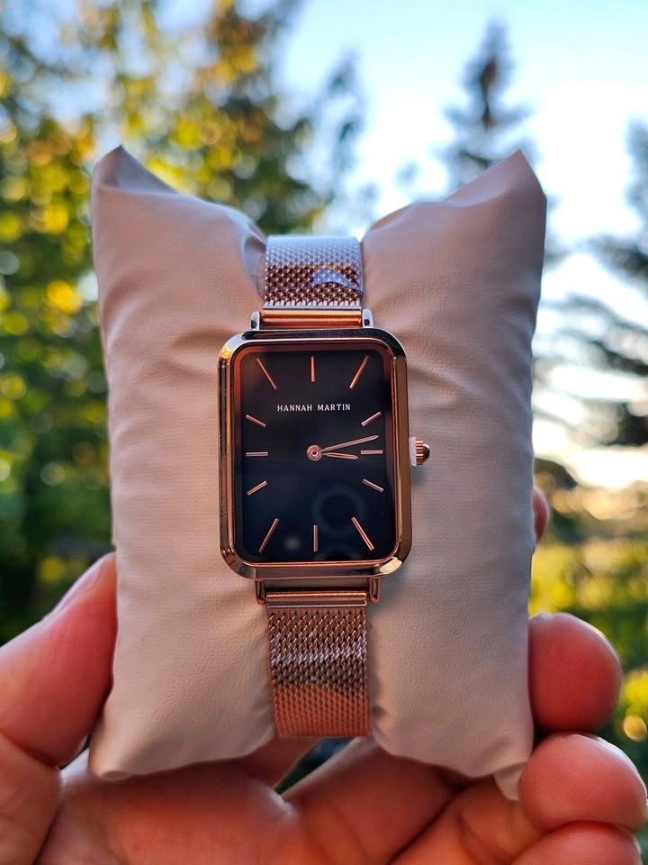 15Beautiful and minimal design. It has a black rectangular face with a rose gold metal mesh band. The style is modern, slim, and easy to wear with any outfit. Brand new, still in the box, never used. Pickup - Taunton and Harmony, Oshawa