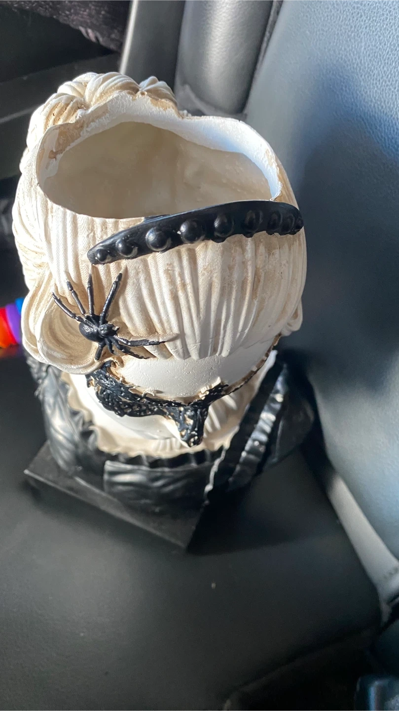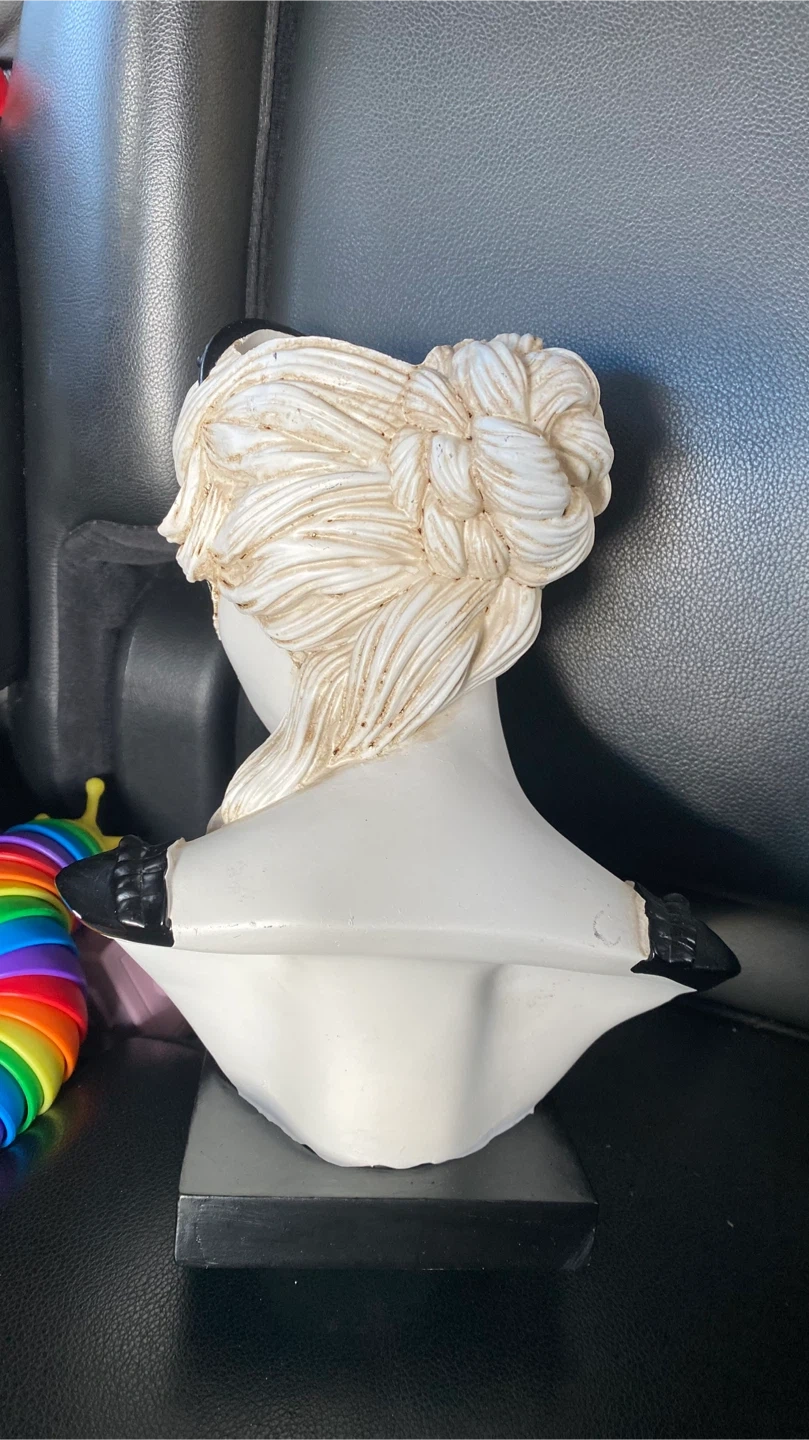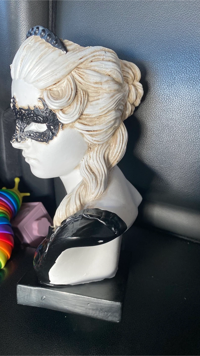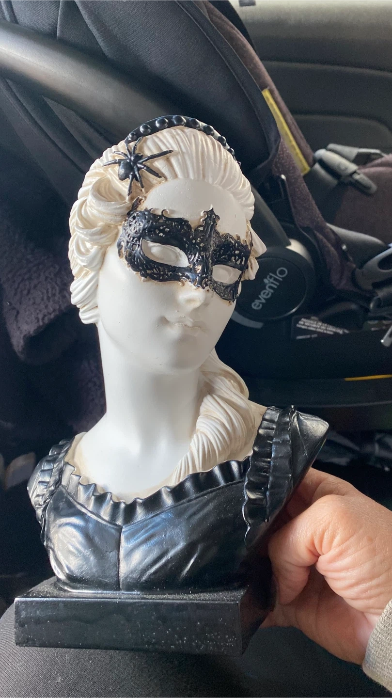 48Selling this bust planter. It's a unique piece with a black base and a white bust. It has a decorative mask and spider accent. Perfect for adding a touch of whimsy to your home or garden!