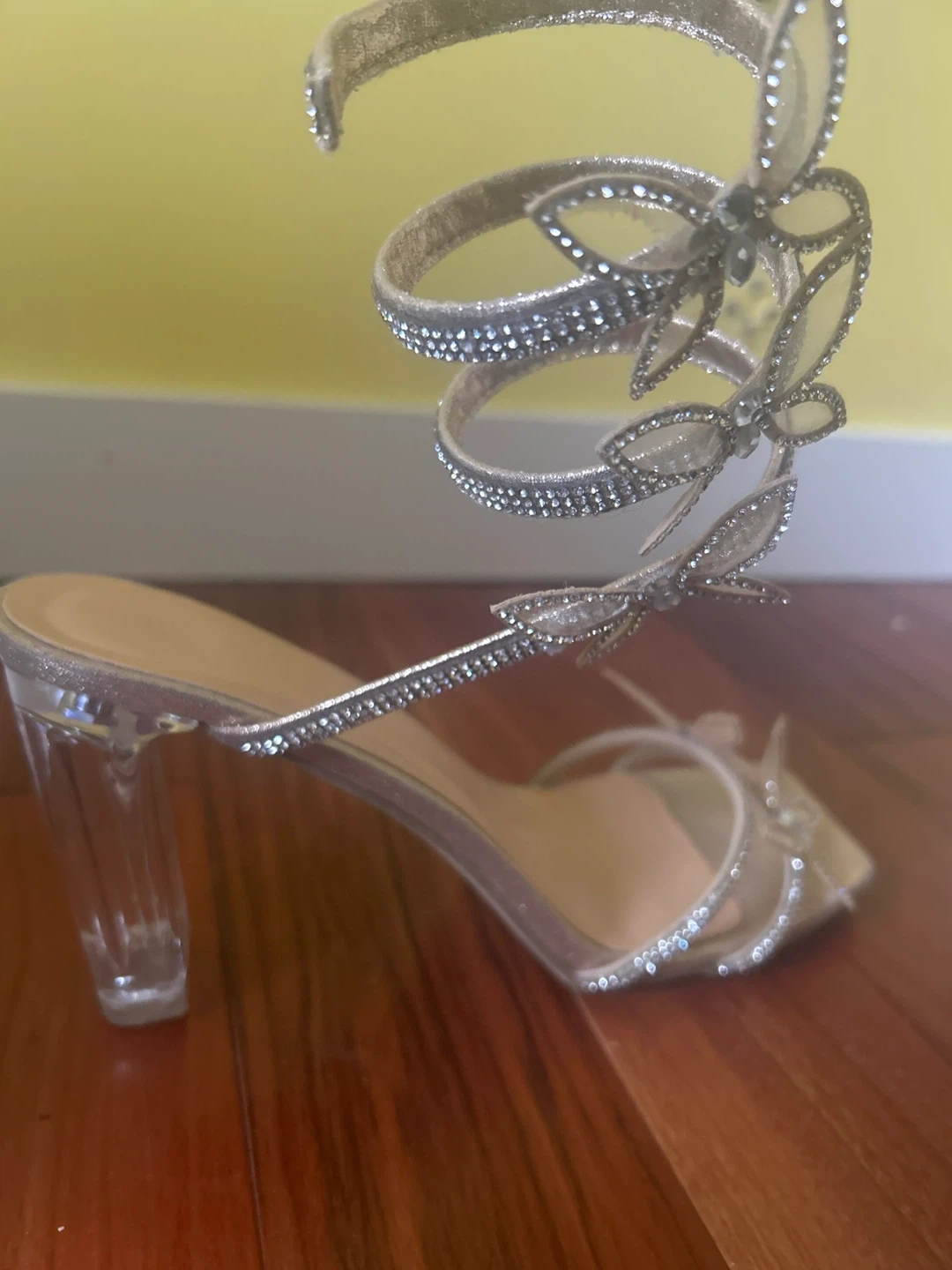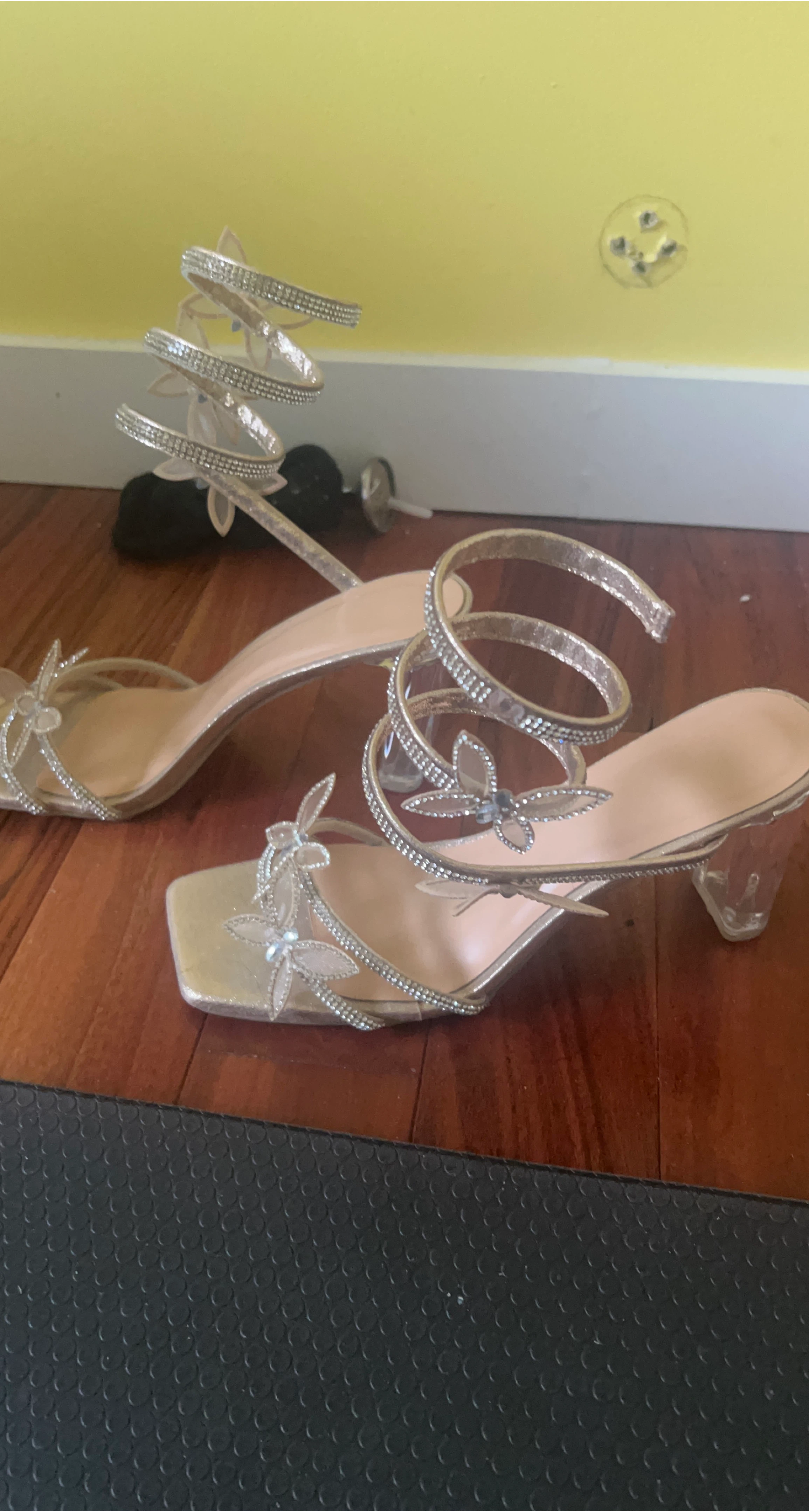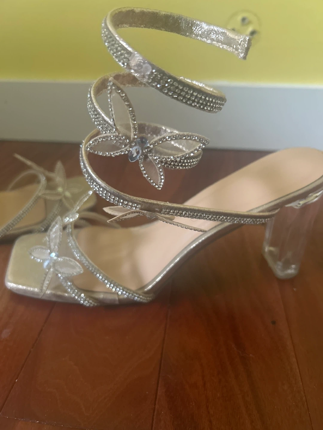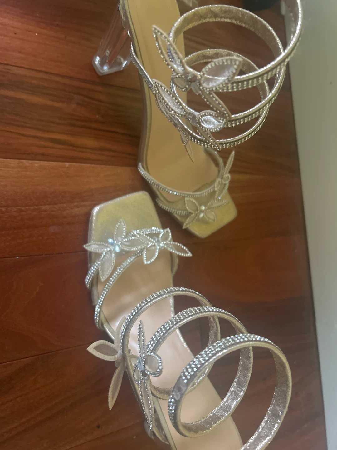 65These light gold butterfly heels are so cute! They feature a spiral strap and clear block heel. Size 9 women’s.