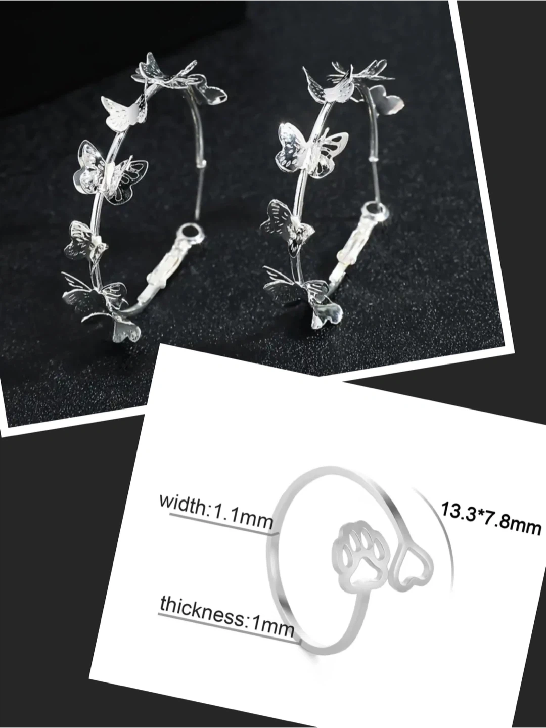 16These cute hoop earrings feature a delicate butterfly design. And ring with paw and heart😻. Price for both items.