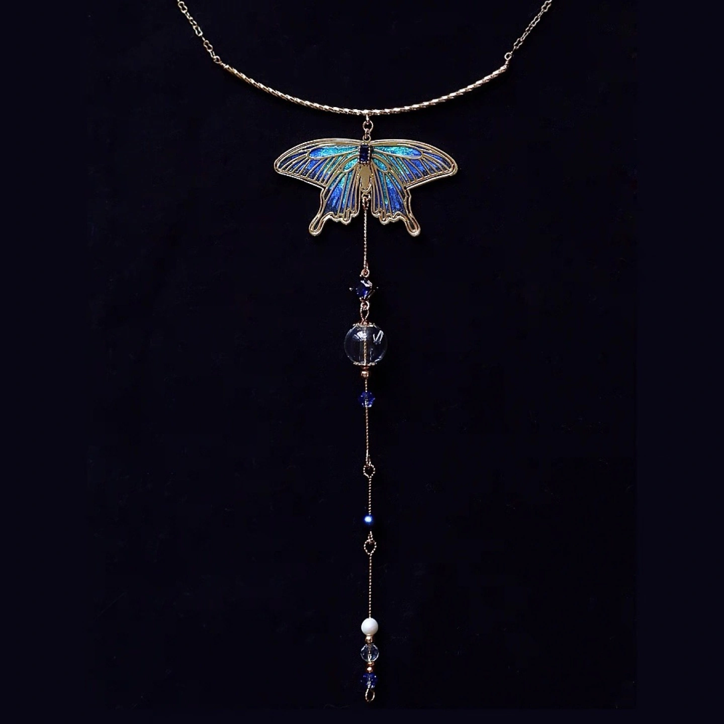 104Beautiful butterfly pendant necklace featuring blue and golden accents! The necklace has a delicate butterfly design with a hanging chain of beads and a clear glass sphere where you can put perfumes in (tool included). It's in great condition and ready to add a touch of elegance to any outfit