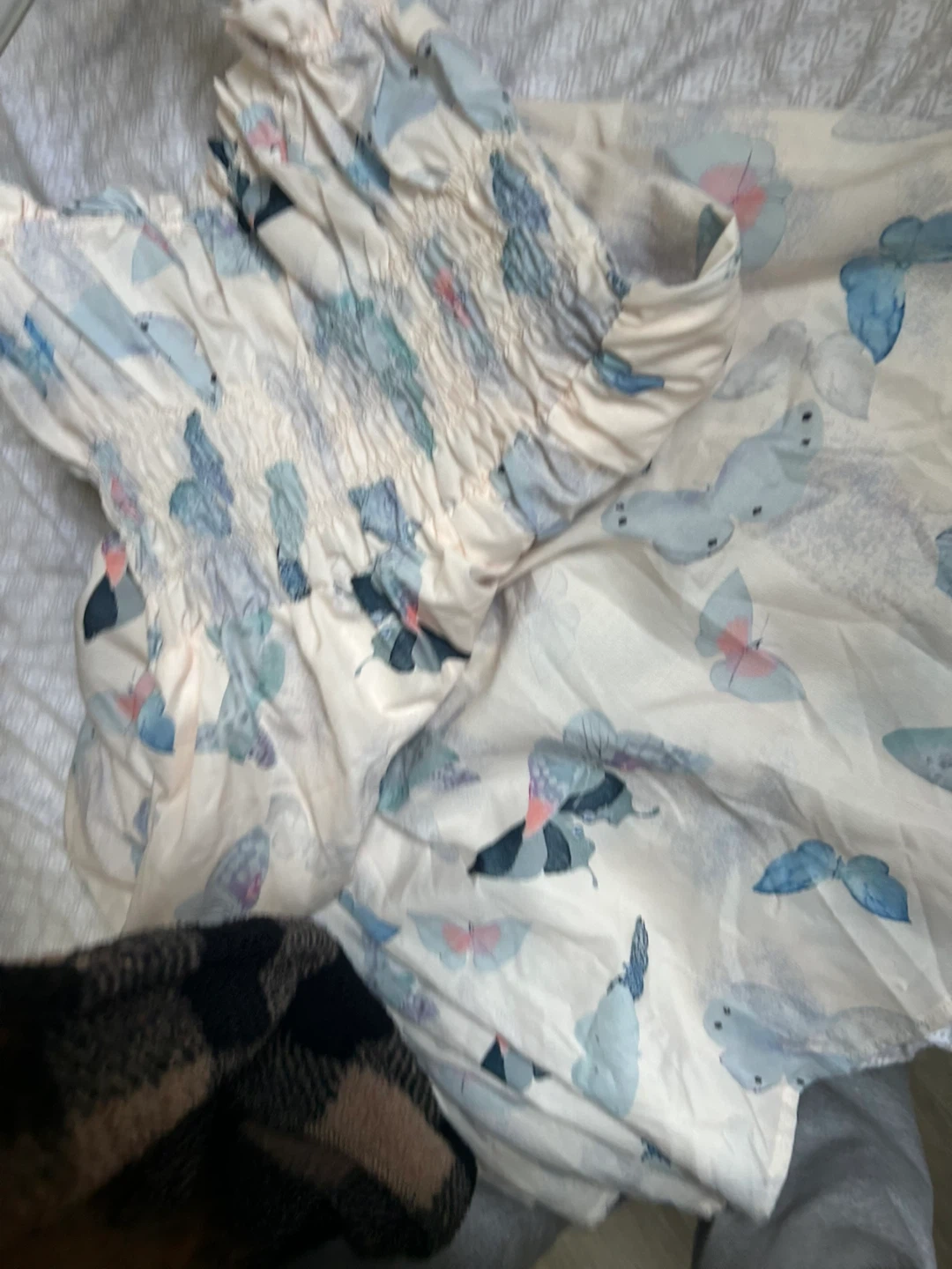 Cute dress with a butterfly print and smocked bodice! It's perfect for spring or summer. The material is lightweight and comfortable, making it great for everyday wear. It's in good condition, brand new and ready for a new home. Selling as this is not my size.