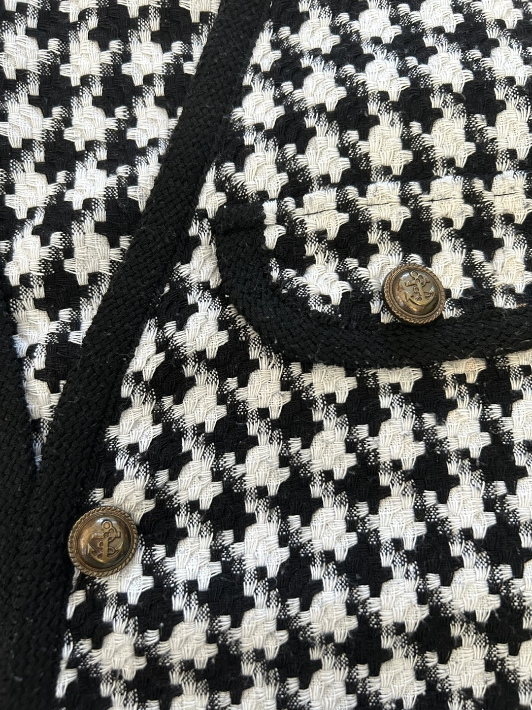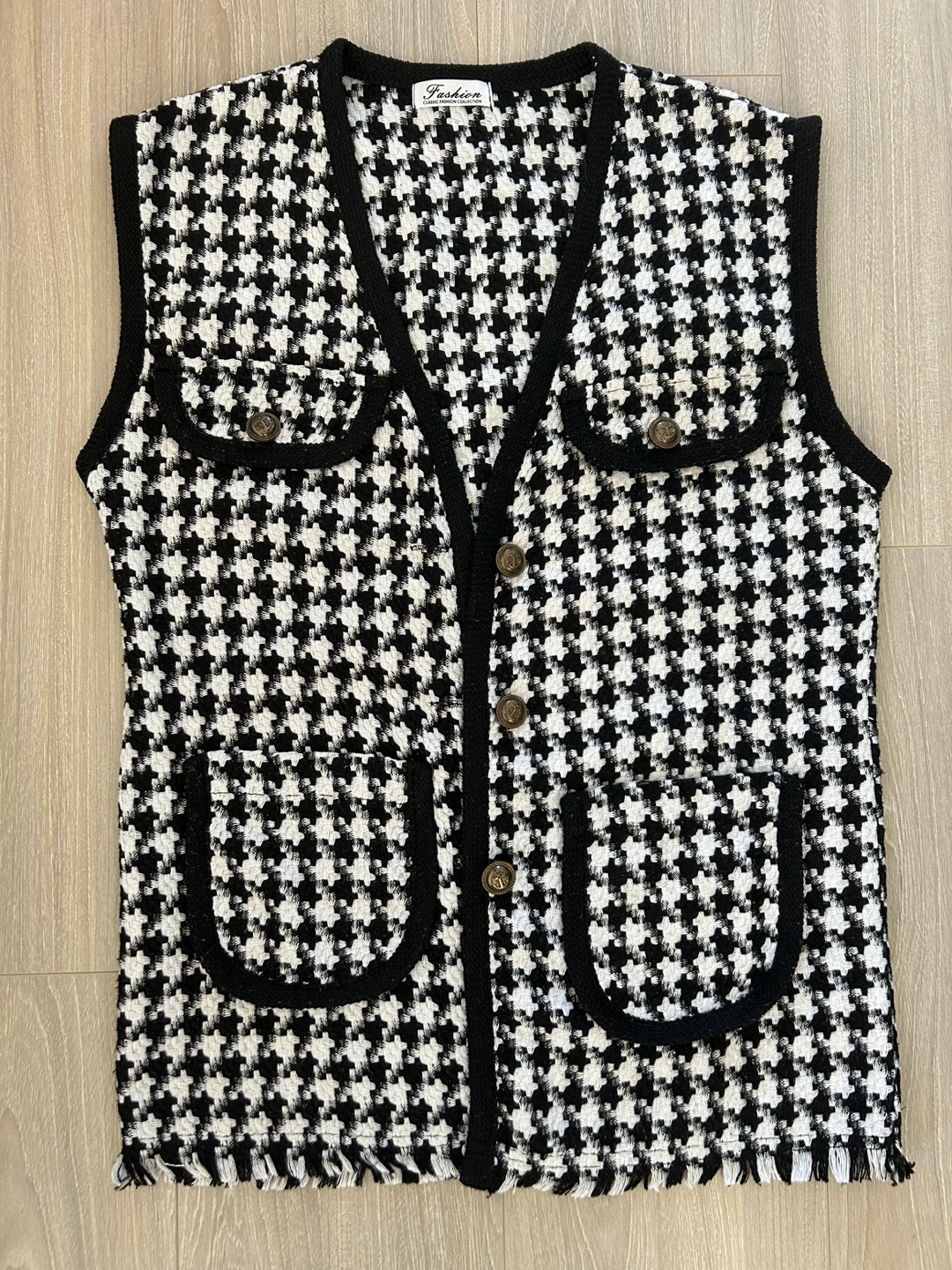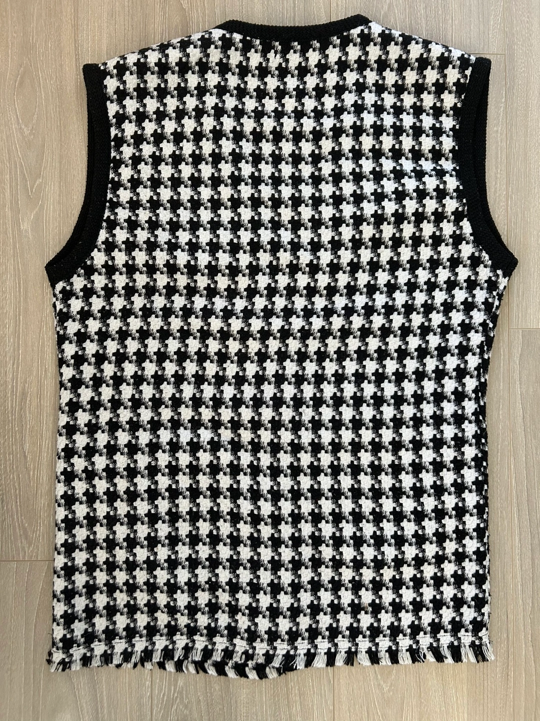 Black and white patterned tweed vest with pockets. Bronze buttons down the front of the vest and on each "pocket" flap on top. It's quite big on me, so looking to pass it off to someone it'll be a better fit for.