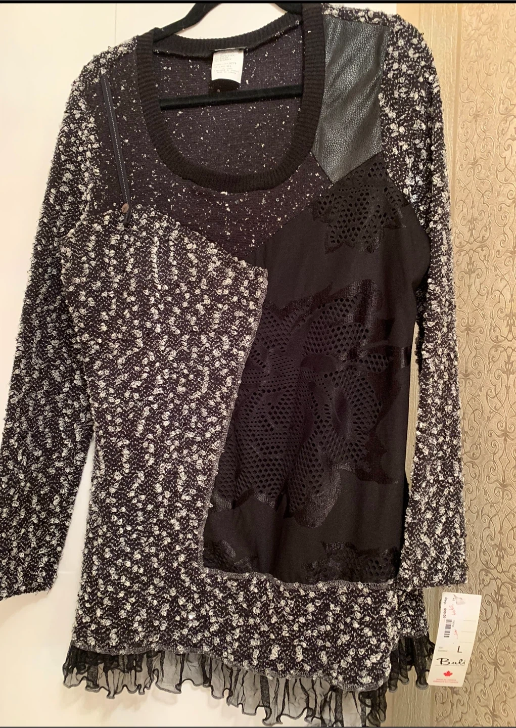 Selling a Bali sweater in size large. It features a unique design with a mix of textures and materials, including a knit body with black accents. Perfect for adding a stylish touch to your wardrobe!