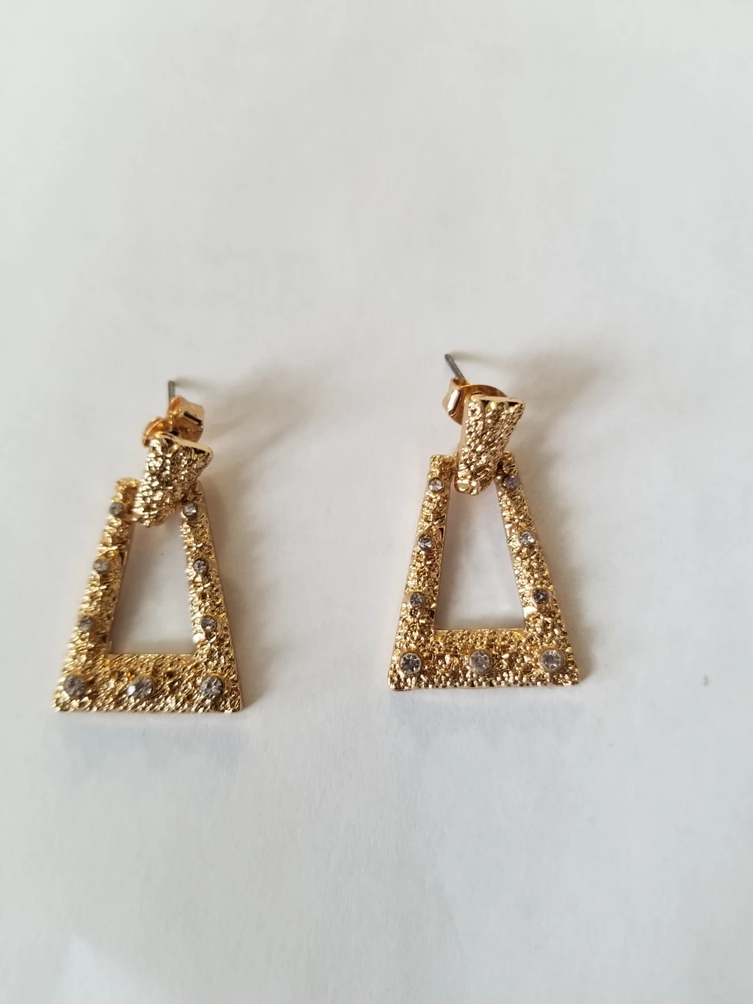 These gold-tone earrings feature a trendy triangular design, encrusted with small rhinestones. They're lightweight and have a post-back closure. Perfect for adding a bit of sparkle to any outfit! Brand new