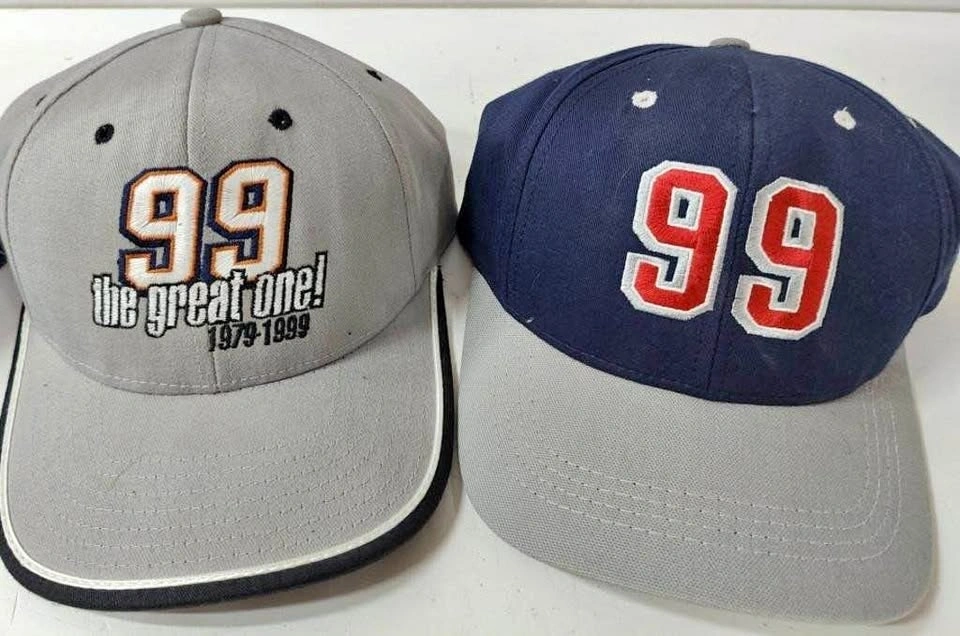 Pair of Wayne Gretzky themed hockey hats featuring the iconic #99 – “The Great One.” Includes two caps: Grey hat with “99 The Great One 1979–1999” embroidery, and a blue/grey hat with a large embroidered 99. Great for Wayne Gretzky fans, hockey memorabilia collectors, or everyday wear for NHL fans. Both hats are in good vintage condition with light wear consistent with age. Selling the pair together. Perfect for any Wayne Gretzky / Oilers fan or hockey memorabilia collection. Pickup near Tottenham (Queen St N area).