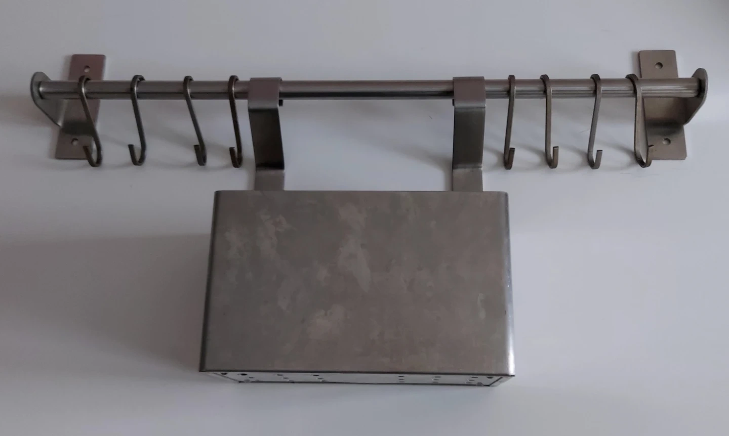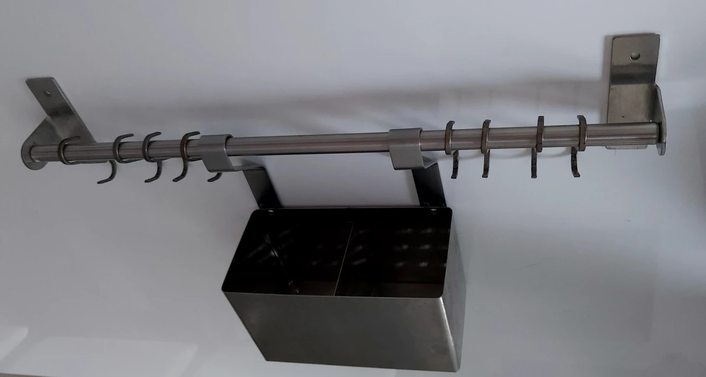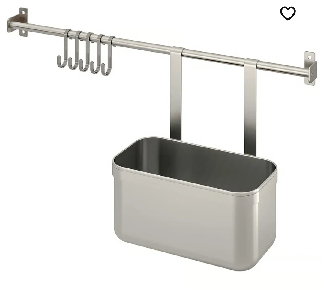 Selling an Ikea stailess rail with a container and hooks. Great for kitchen storage and organization! It's in good condition and ready to use.