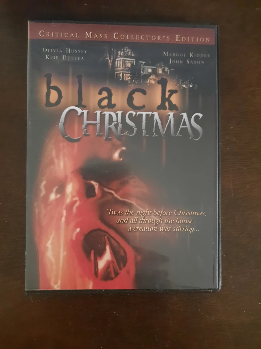 This is the Black Christmas Critical Mass Collector's Edition DVD. It stars Olivia Hussey, Keir Dullea, Margot Kidder, and John Saxon. A creature was stirring on Christmas night!