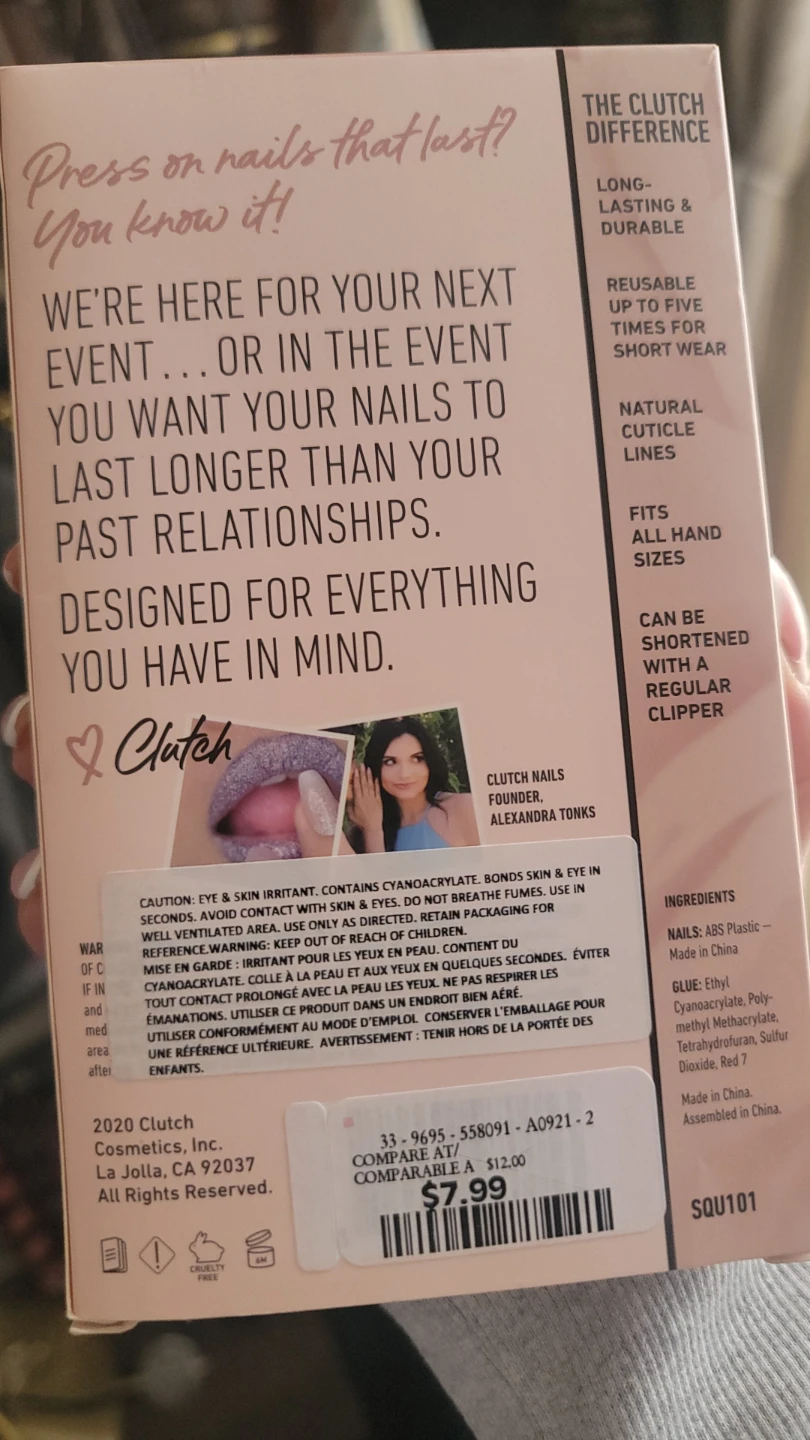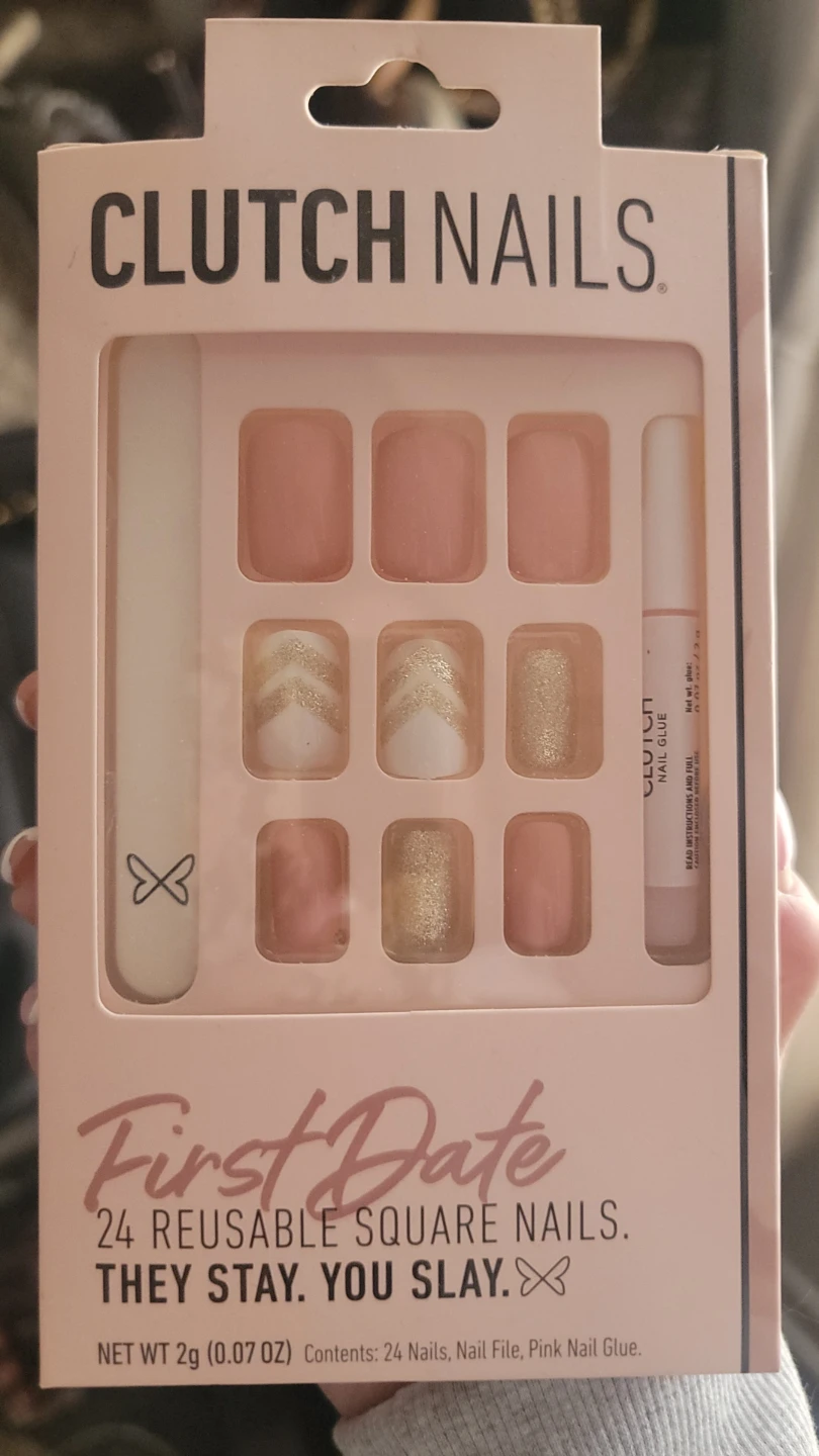 Get salon-worthy nails with Clutch Nails. This set includes 24 reusable square nails, a nail file, and pink nail glue. They're designed for long-lasting wear and can be shortened with a regular clipper. Perfect for when you want your nails to last longer!