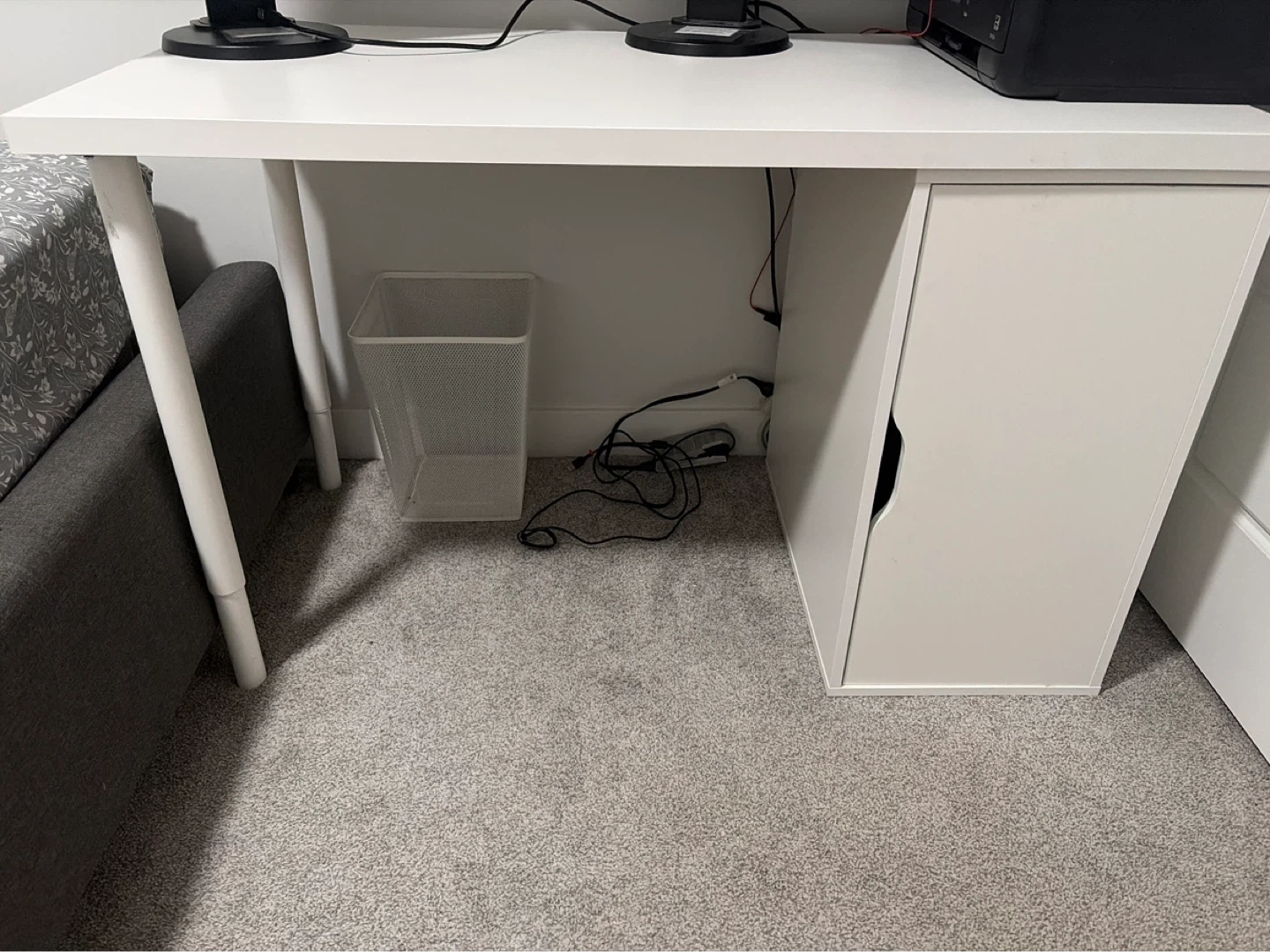 Simple white desk with an integrated storage cabinet on the right side. It's perfect for a home office or study area. The cabinet door has a cutout handle for easy access.