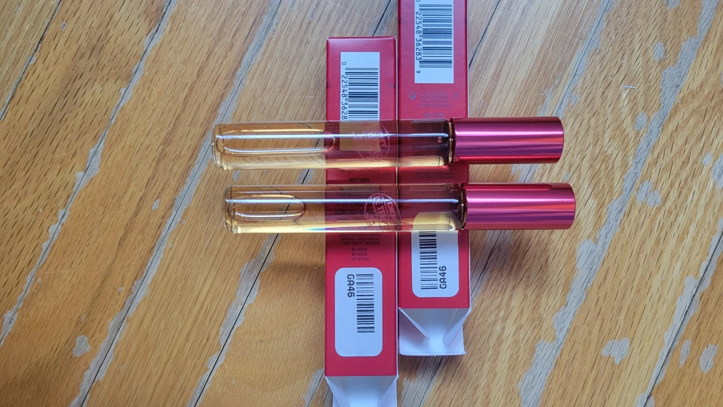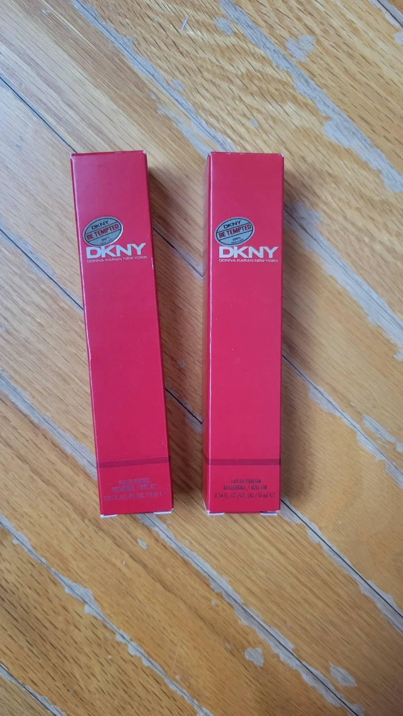 Two DKNY Be Tempted Eau de Parfum rollerballs. Each rollerball is 10ml, for a total of 20ml. They're individually boxed. This perfume is a floral fruity fragrance.