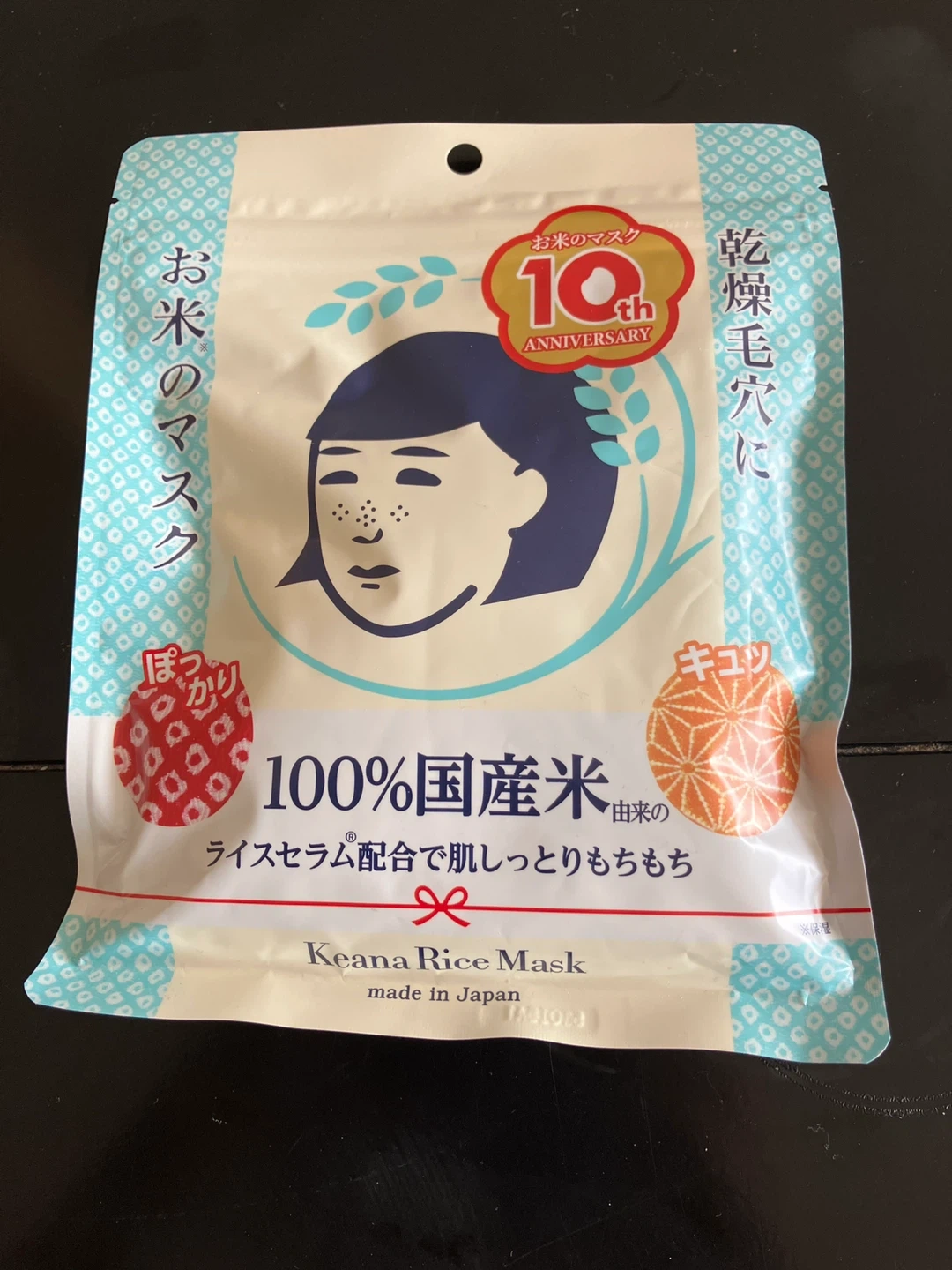 Keana Rice Mask for smooth and bouncy skin. Formulated with 100% Japanese rice serum. Contains rice extract and rice ceramide for skin elasticity. 10 sheets mask included.