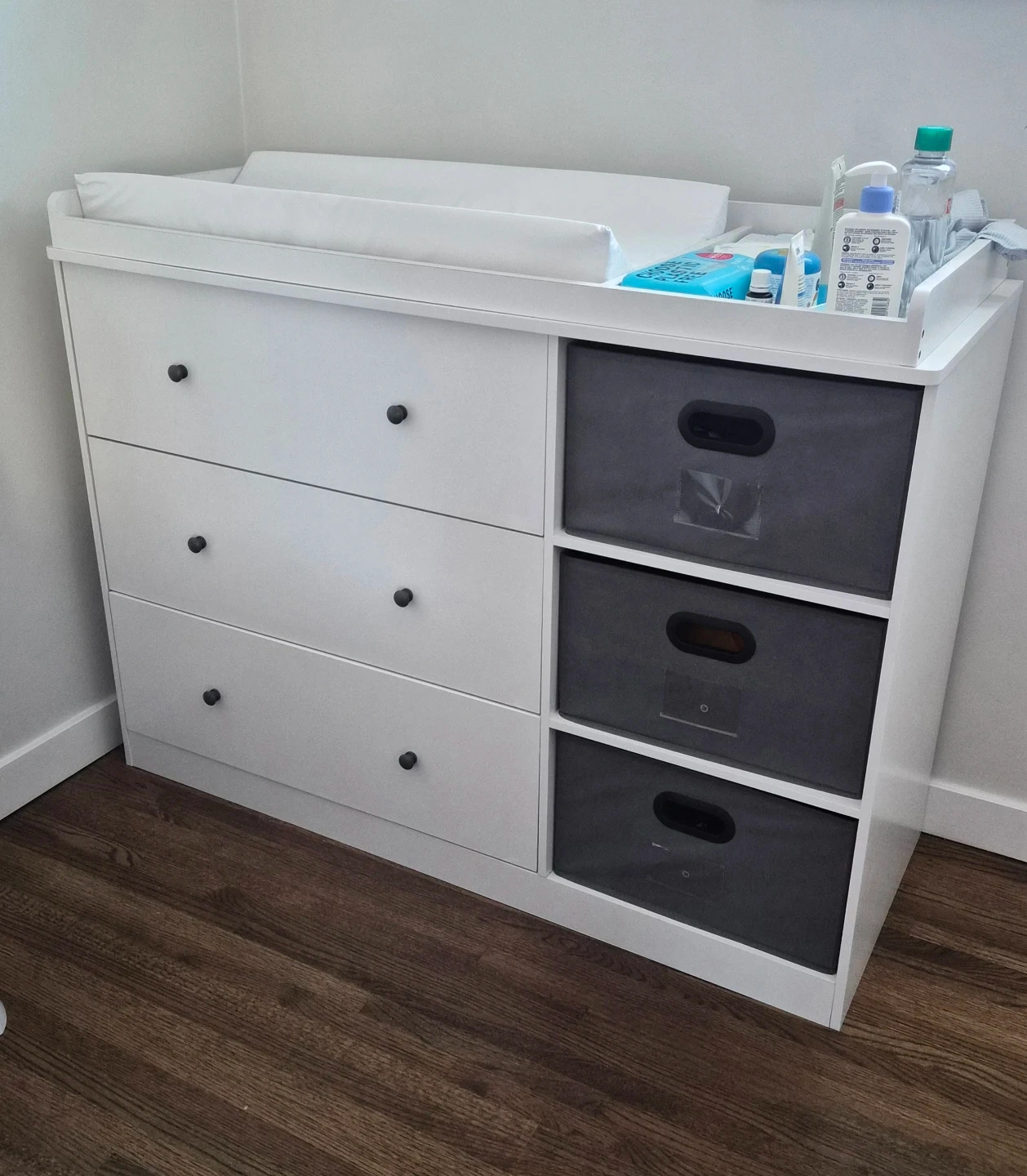 White dresser with three drawers and three fabric bins, perfect for nursery storage. Includes a changing pad on top. Great for organizing baby essentials!