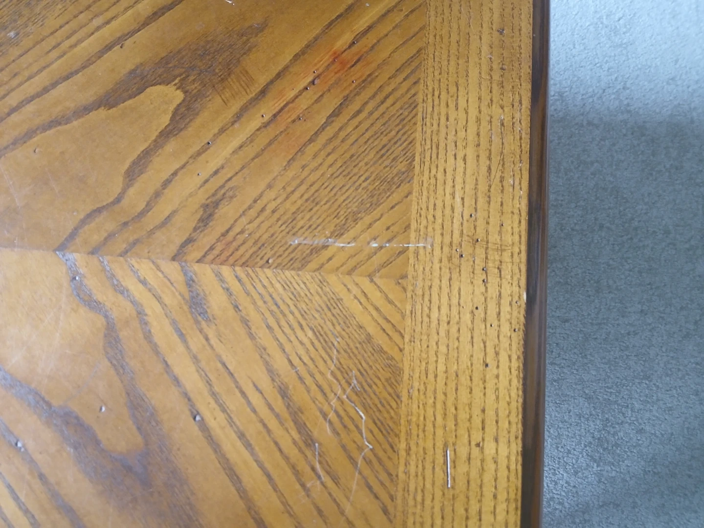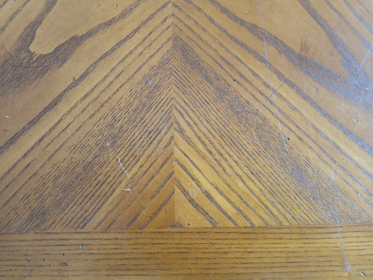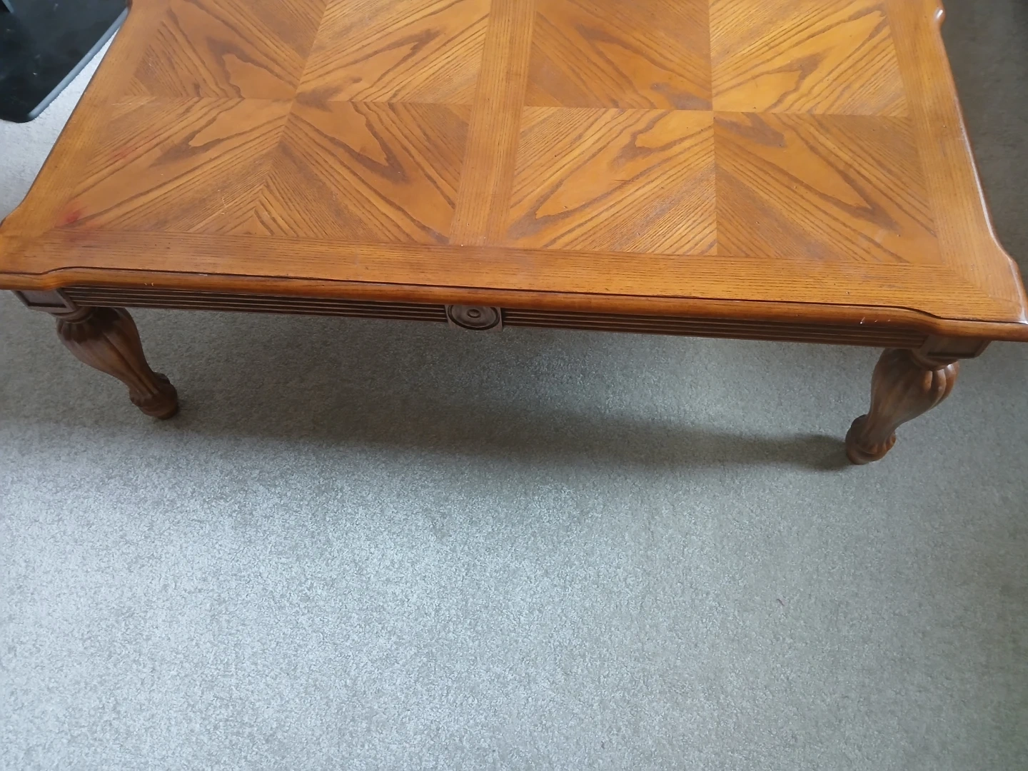 This classic and beautiful Oak coffee table has a decorative wood inlay top and carved legs. It's a nice size for a living room. Oak wood construction. Giving any room a classic character!