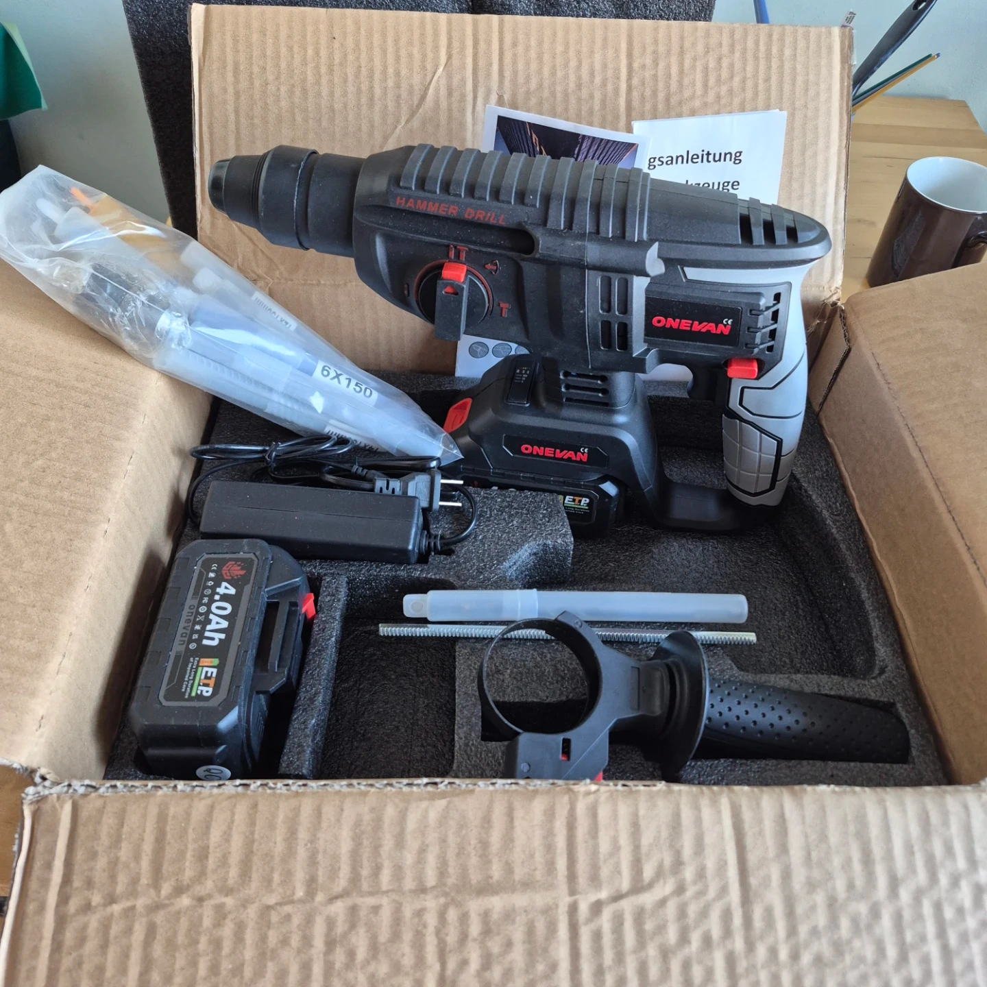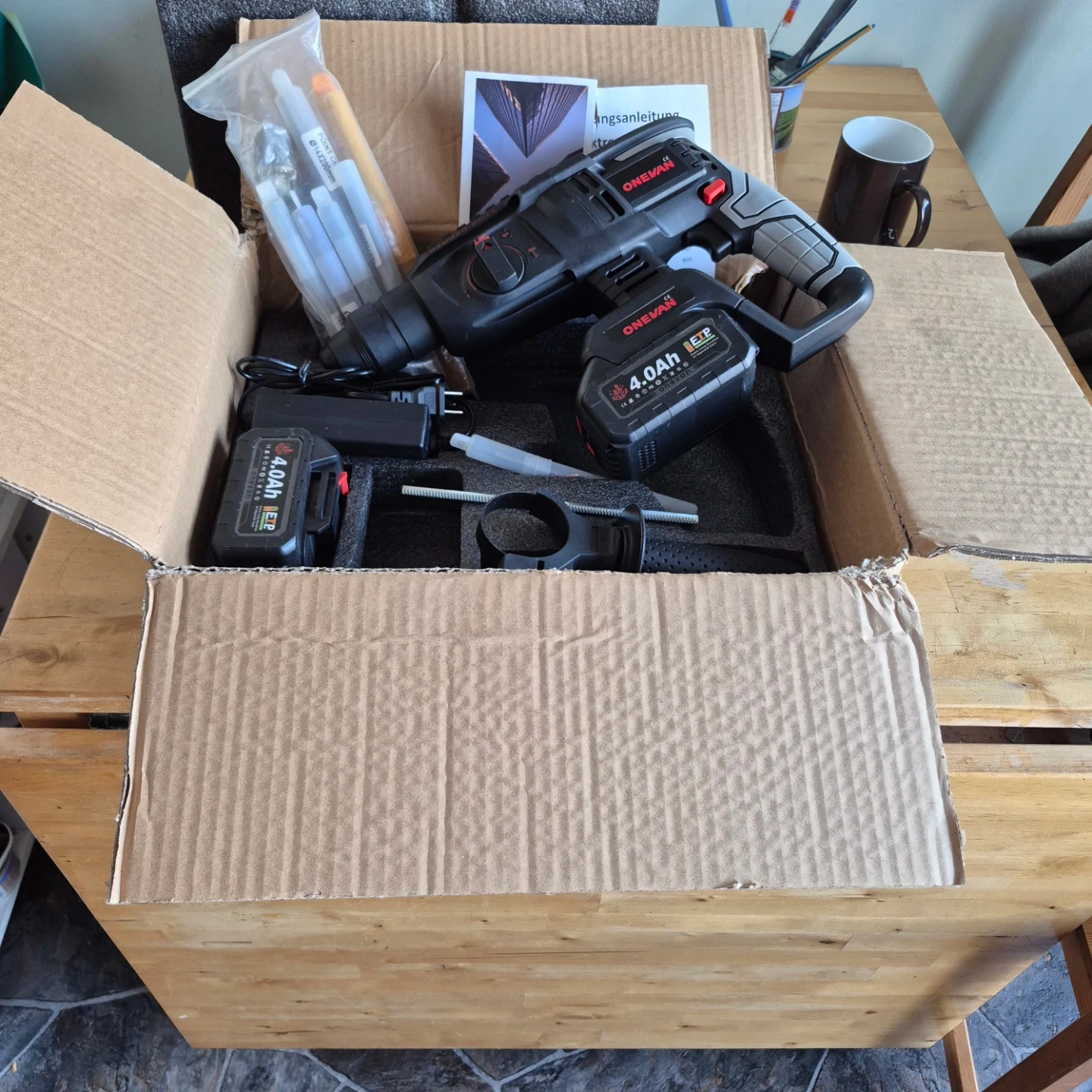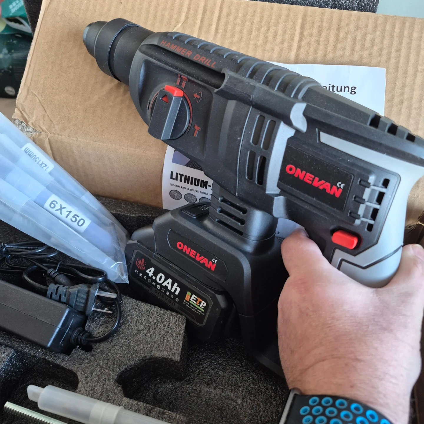 This ONEVAN hammer drill comes with two 4.0Ah lithium-ion batteries and a charger. It includes a chisel bit and extra drill bits. The drill also features a helpful side handle for better control. Great for construction projects!
